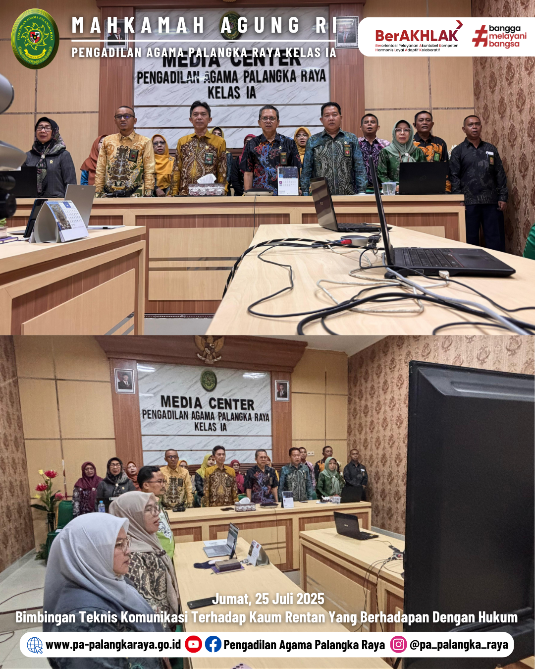 Pengadilan Agama Palangka Raya mengikuti “Bimbingan Teknis Komunikasi Terhadap Kaum Rentan Yang Berhadapan Dengan Hukum” yang diselenggarakan secara daring oleh Direktorat Jenderal Badan Peradilan Agama Mahkamah Agung RI. Kegiatan berlangsung tepat pada pukul 08.00 WIB bertempat di ruang Media Center Pengadilan Agama Palangka Raya, yang diikuti para hakim dan tenaga teknis kepaniteraan Pengadilan Agama Palangka Raya. (25/07/2025).