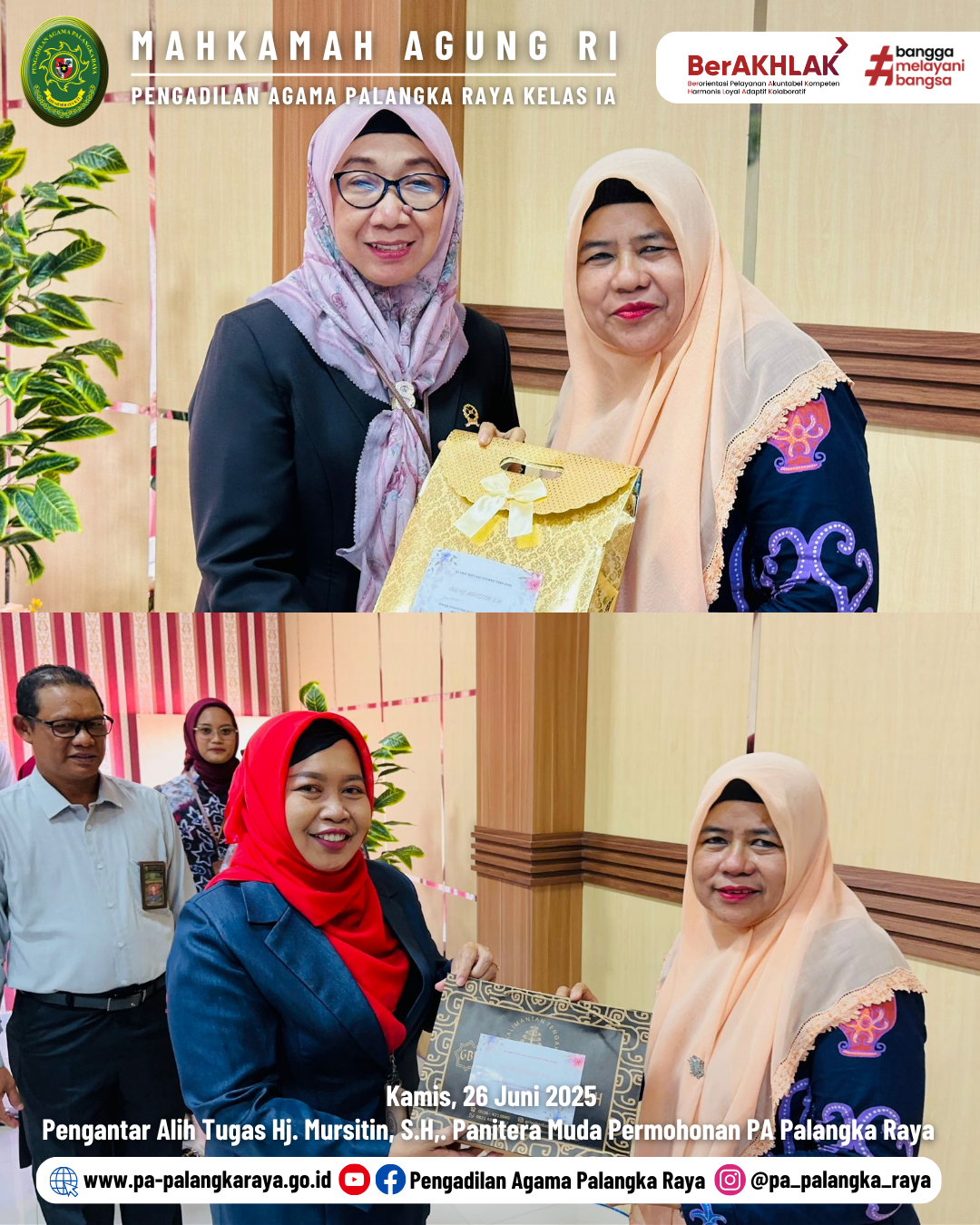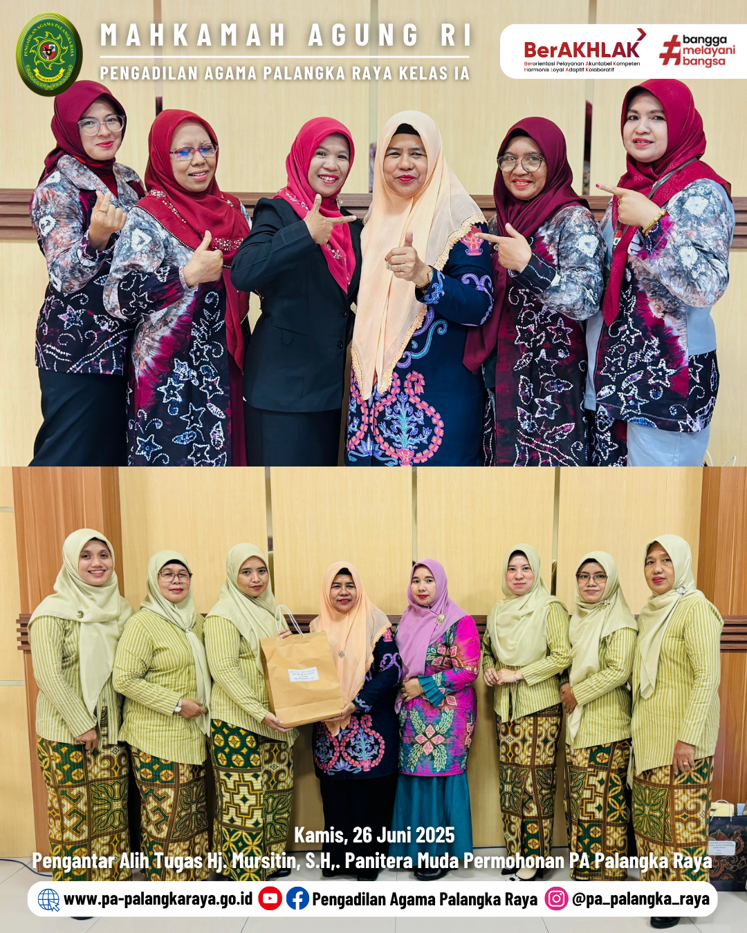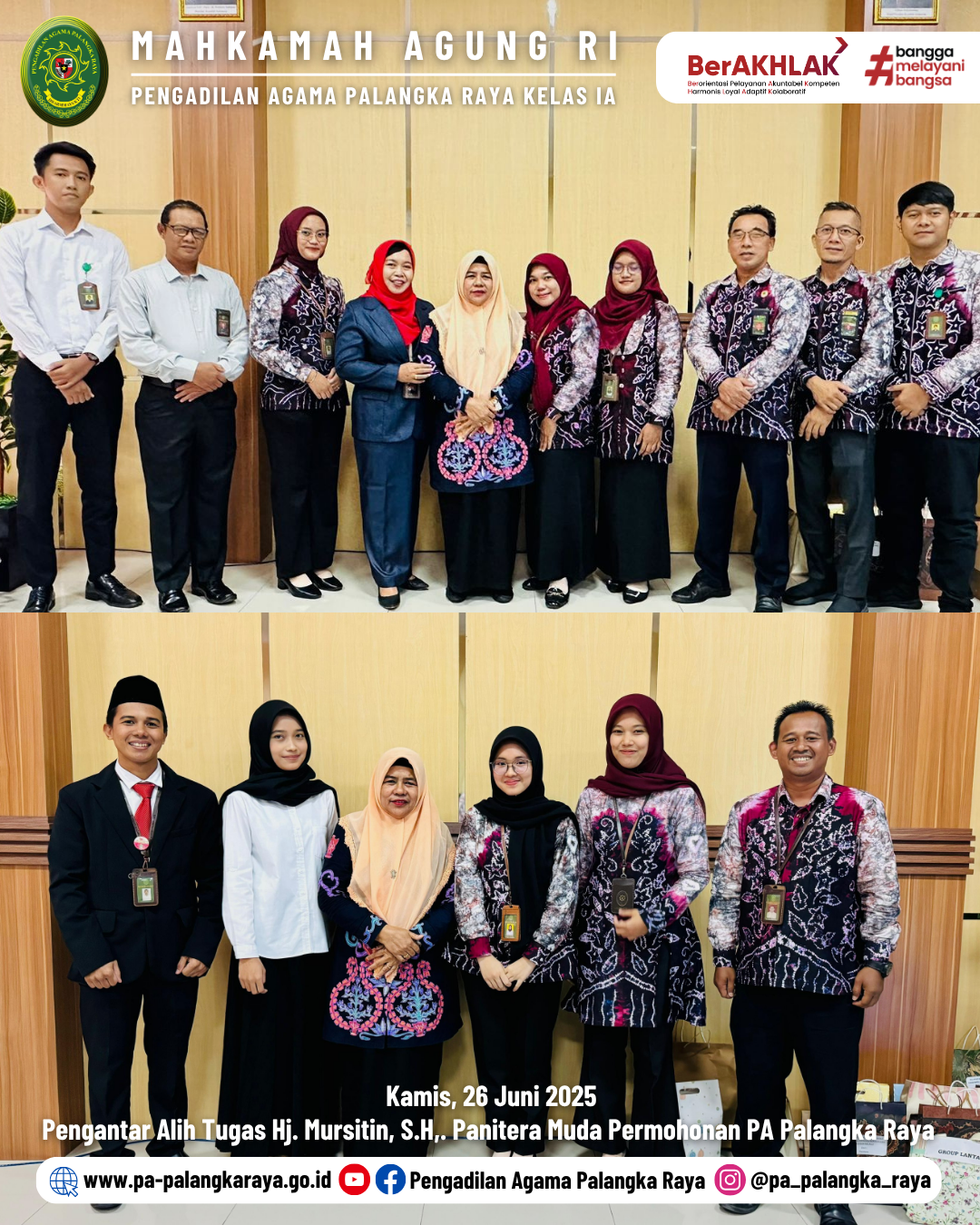 Ada pertemuan pasti ada perpisahan, “ada yang pergi” dan “ada yang datang”. Mestinya kita sadar bahwa cepat atau lambat kita akan berpisah, kenangan baik yang kita ukir selama bekerja akan dikenang oleh generasi berikutnya sepanjang masa. Momentum pengantar alih tugas Hj. Mursitin, S.H (Panmud Permohonan) Pengadilan Agama Palanagka Raya dipromosi menjadi Panitera Pengganti PTA Palangka Raya. Acara berlangsung begitu syahdu tersebut dihadiri oleh Ketua, Hakim, Panitera, Sekretaris, serta aparatur Pengadilan Agama Palangka Raya. (26/06/2025).