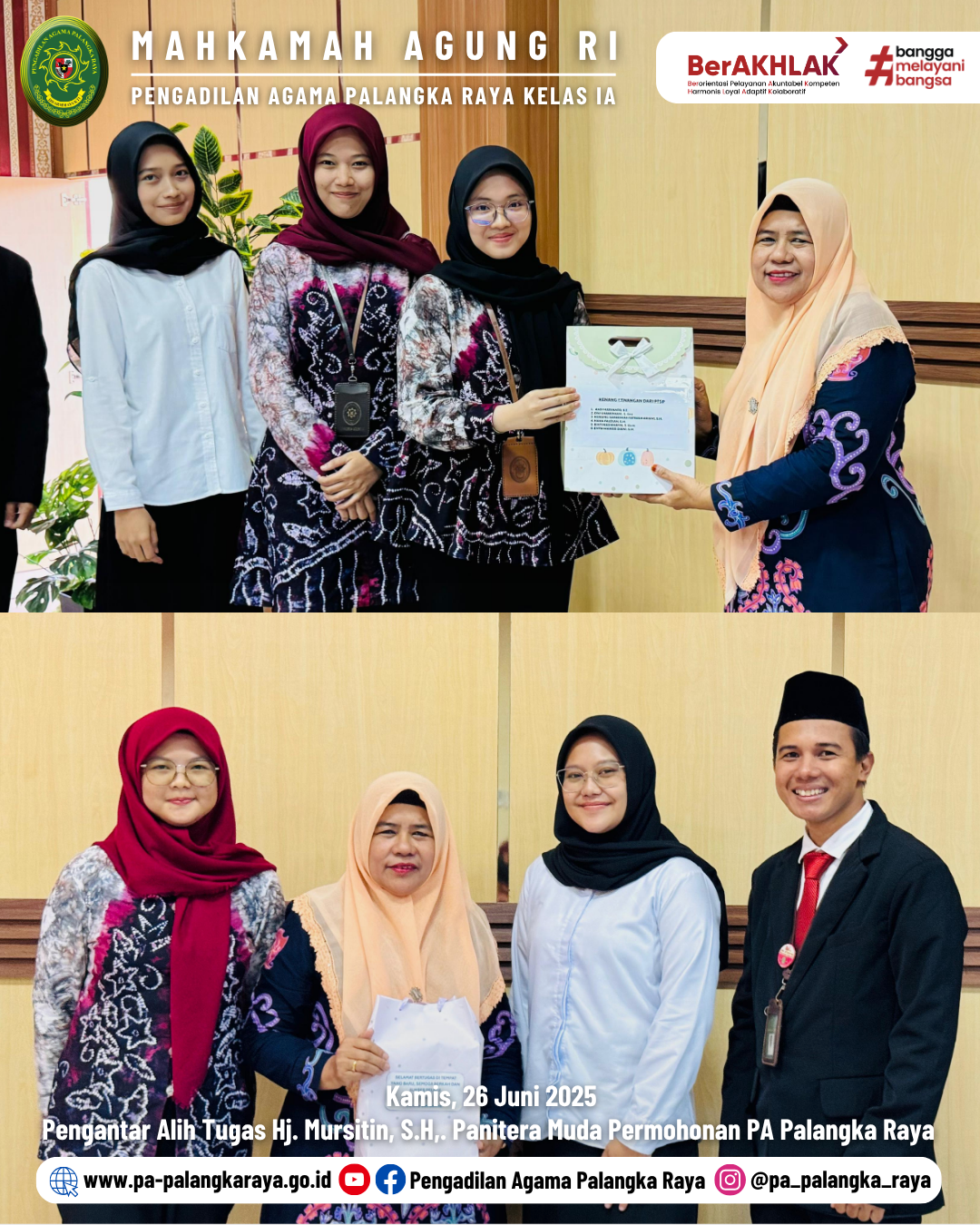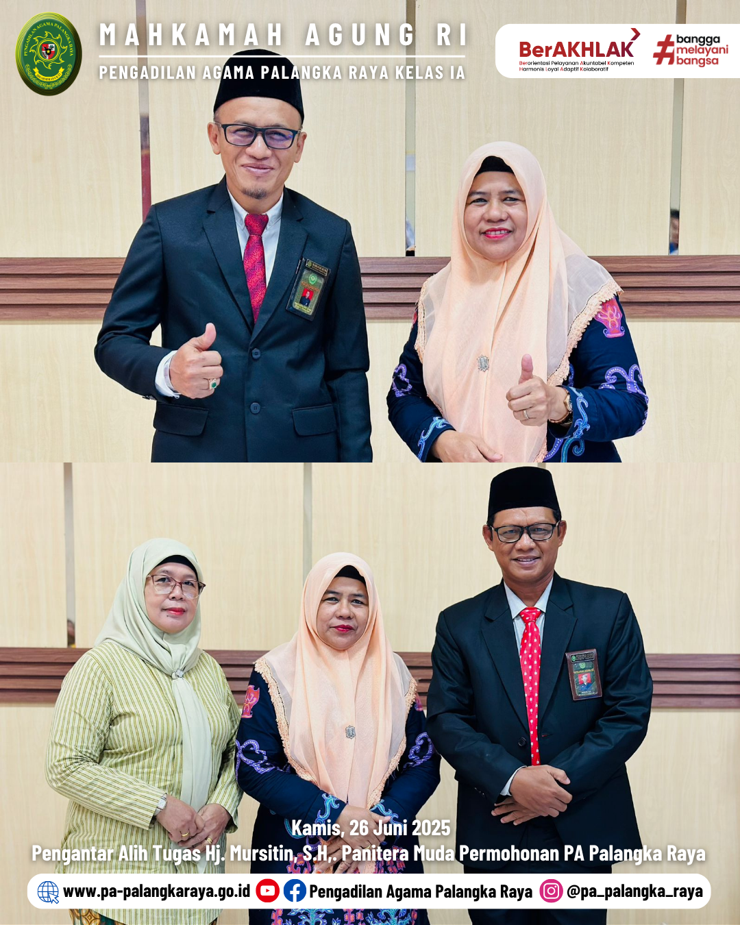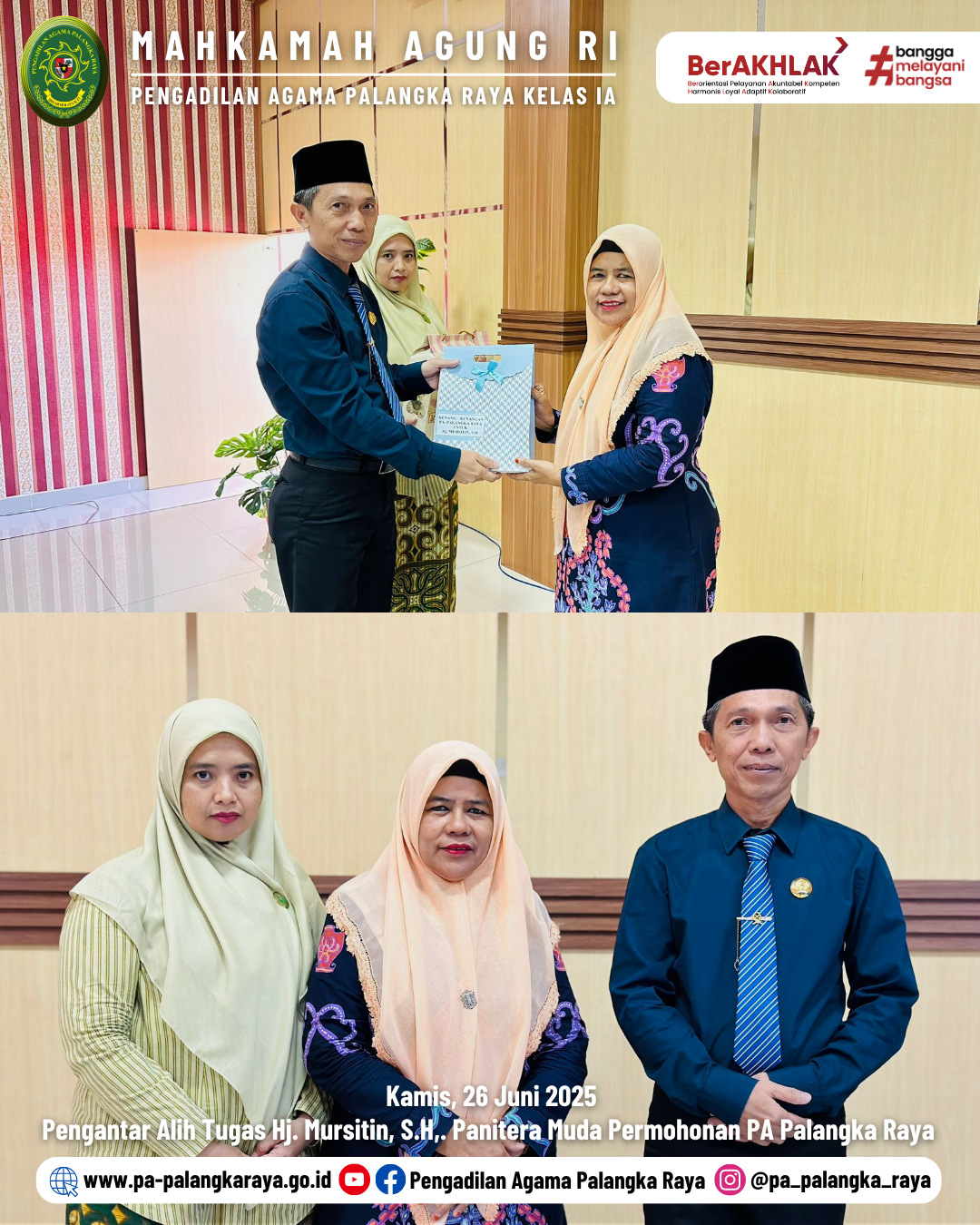 Ada pertemuan pasti ada perpisahan, “ada yang pergi” dan “ada yang datang”. Mestinya kita sadar bahwa cepat atau lambat kita akan berpisah, kenangan baik yang kita ukir selama bekerja akan dikenang oleh generasi berikutnya sepanjang masa. Momentum pengantar alih tugas Hj. Mursitin, S.H (Panmud Permohonan) Pengadilan Agama Palanagka Raya dipromosi menjadi Panitera Pengganti PTA Palangka Raya. Acara berlangsung begitu syahdu tersebut dihadiri oleh Ketua, Hakim, Panitera, Sekretaris, serta aparatur Pengadilan Agama Palangka Raya. (26/06/2025).