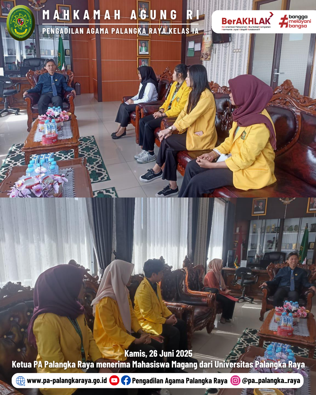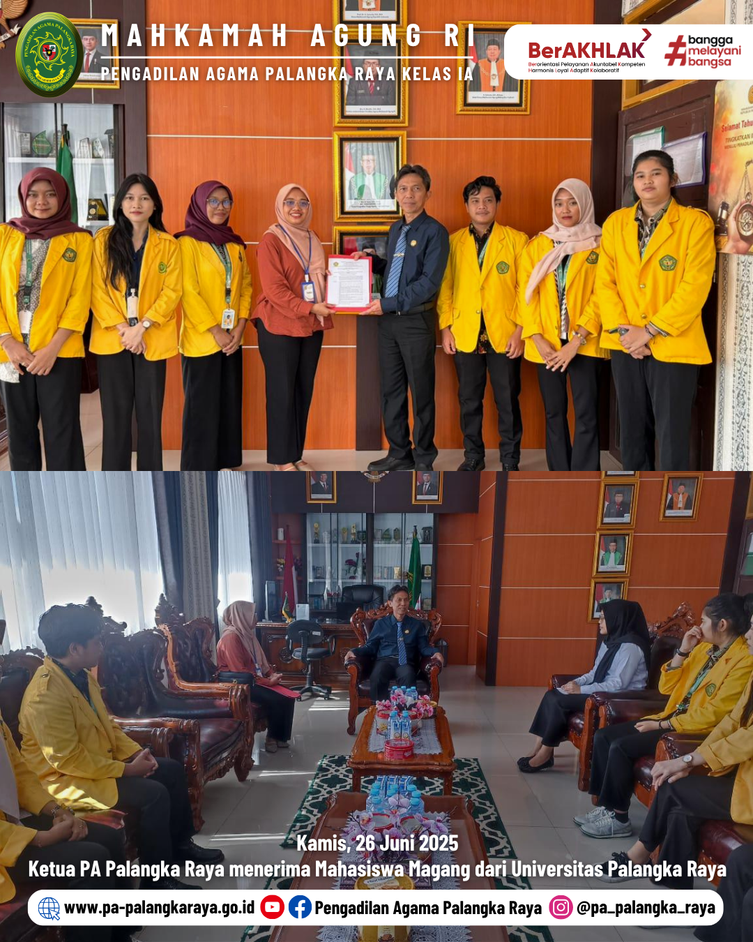 Ketua Pengadilan Agama Palangka Raya Dr. Yusri, S.Ag., M.H secara resmi menerima kedatangan mahasiswa magang dari Fakultas Hukum Universitas Palangka Raya (UPR) di ruang kerjanya lantai 3. Kegiatan ini merupakan bagian dari program praktik lapangan yang bertujuan memberikan pengalaman langsung kepada mahasiswa mengenai proses peradilan di lembaga hukum, sehingga siap saat terjun ke dunia kerja. (26/06/2025).