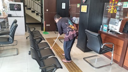 Pembersihan dilakukan secara menyeluruh, meliputi penyapuan lantai, pengelapan meja pelayanan, pembersihan kaca, serta penataan ulang kursi tunggu agar terlihat rapi dan nyaman. Selain itu, petugas juga memeriksa kebersihan fasilitas pendukung seperti tempat sampah dan area publik lainnya untuk memastikan tidak ada kotoran atau sampah yang tertinggal.