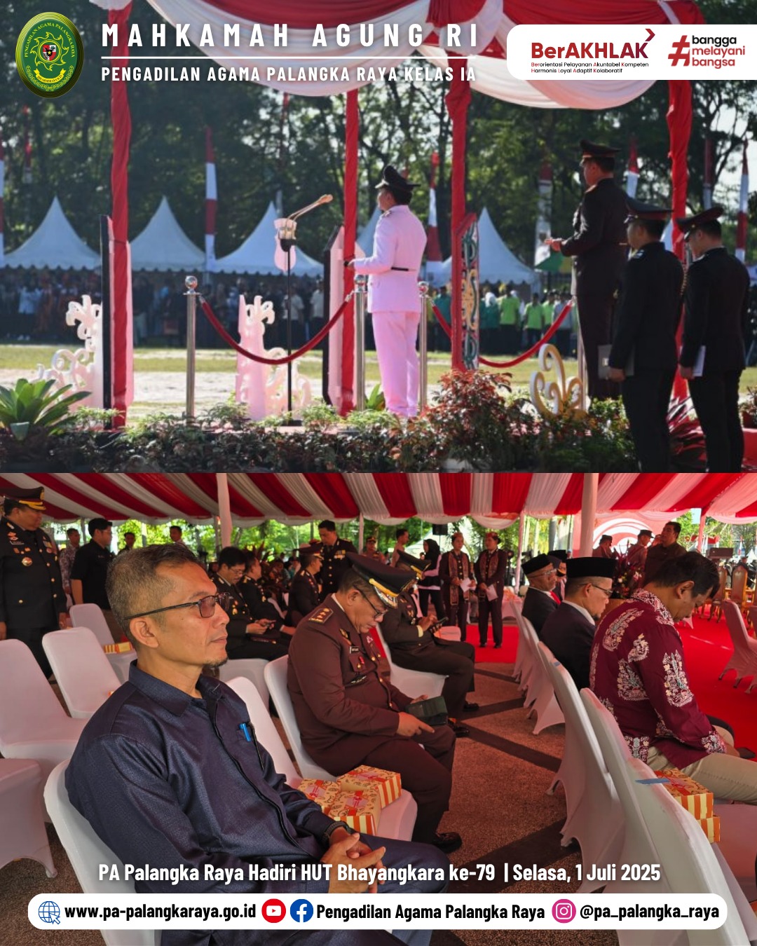 Palangka Raya, – Pengadilan Agama (PA) Palangka Raya diwakili oleh Norrachmad Ariaynto, S.T., M.E., menghadiri acara Hari Ulang Tahun (HUT) Bhayangkara ke-79 yang diselenggarakan oleh Polda Kalimantan Tengah. Acara ini merupakan momen penting bagi Polri untuk memperingati sejarah dan dedikasi mereka dalam menjaga keamanan dan ketertiban masyarakat.