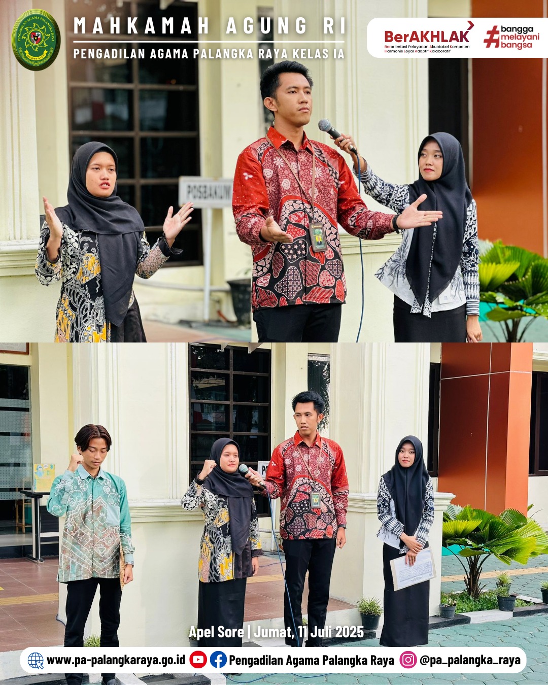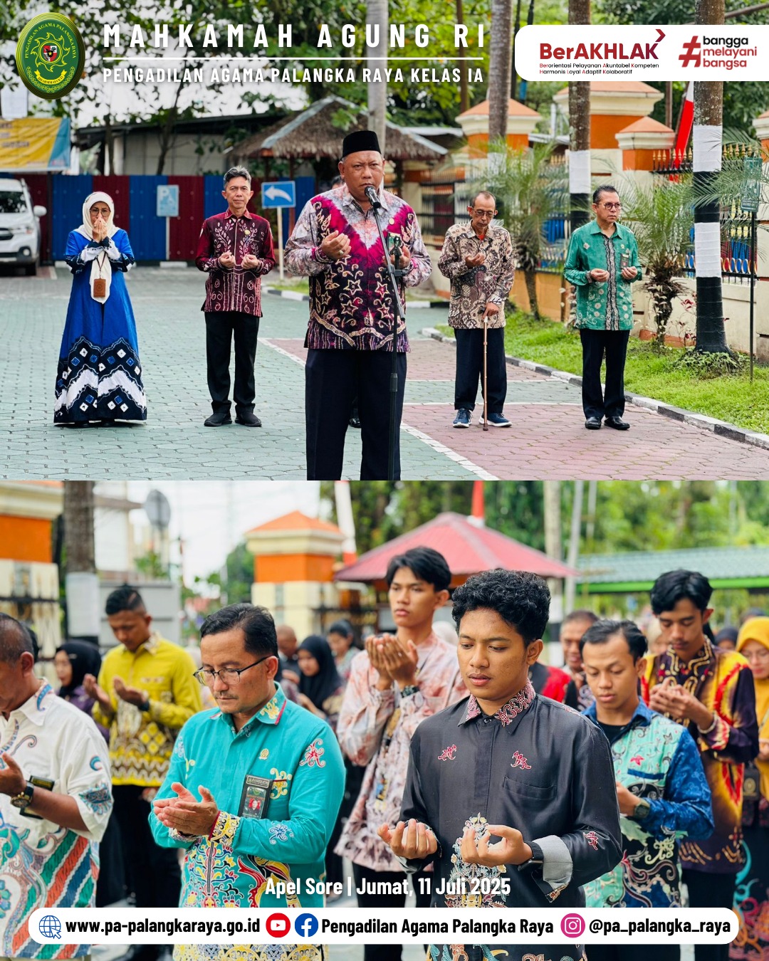 Kegiatan rutin tersebut berlangsung di halaman kantor Pengadilan Agama Palangka Raya di Jalan Kapten Piere Tendean tepat pada pukul 16.00 WIB, dengan diikuti oleh para hakim, seluruh aparatur dan PPNPN Pengadilan Agama Palangka Raya. (11/07/2025).