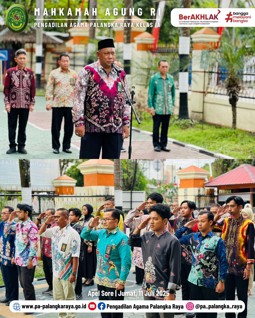 Bertindak sebagai Pembina Apel H.M. Sa’dan, S.Ag selaku Ketua Pengadilan Agama Palangka Raya dengan pemimpin apel sdr. Tholib Indra Irianto dan Dimas F Widiatmoko, S.T, sebagai pembaca 8 (delapan) Nilai Utama Mahkamah Agung dilanjutkan dengan yel yel Mahkamah Agung, yel-yel Badilag, yel-yel PTA Palangka Raya dan Saputri Rizki Ramadhanti, A.Md. Ak. sebagai pembaca motto Pengadilan Agama Palangka Raya, yang diikuti oleh seluruh peserta apel sore.