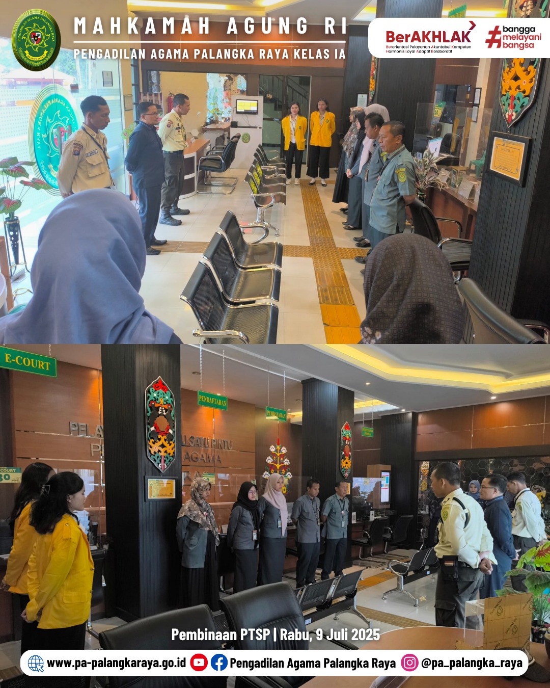 Pengadilan Agama Palangka Raya berupaya meningkatkan kualitas layanan kepada masyarakat melalui kegiatan rutin briefing pagi. Kegiatan ini bertujuan untuk meneguhkan komitmen dan disiplin bagi para petugas Pelayanan Terpadu Satu Pintu (PTSP) serta petugas keamanan dan layanan lainnya serta sebagai bagian dan upaya berkelanjutan untuk menjaga kualitas pelayanan yang optimal kepada masyarakat. (09/07/2025).