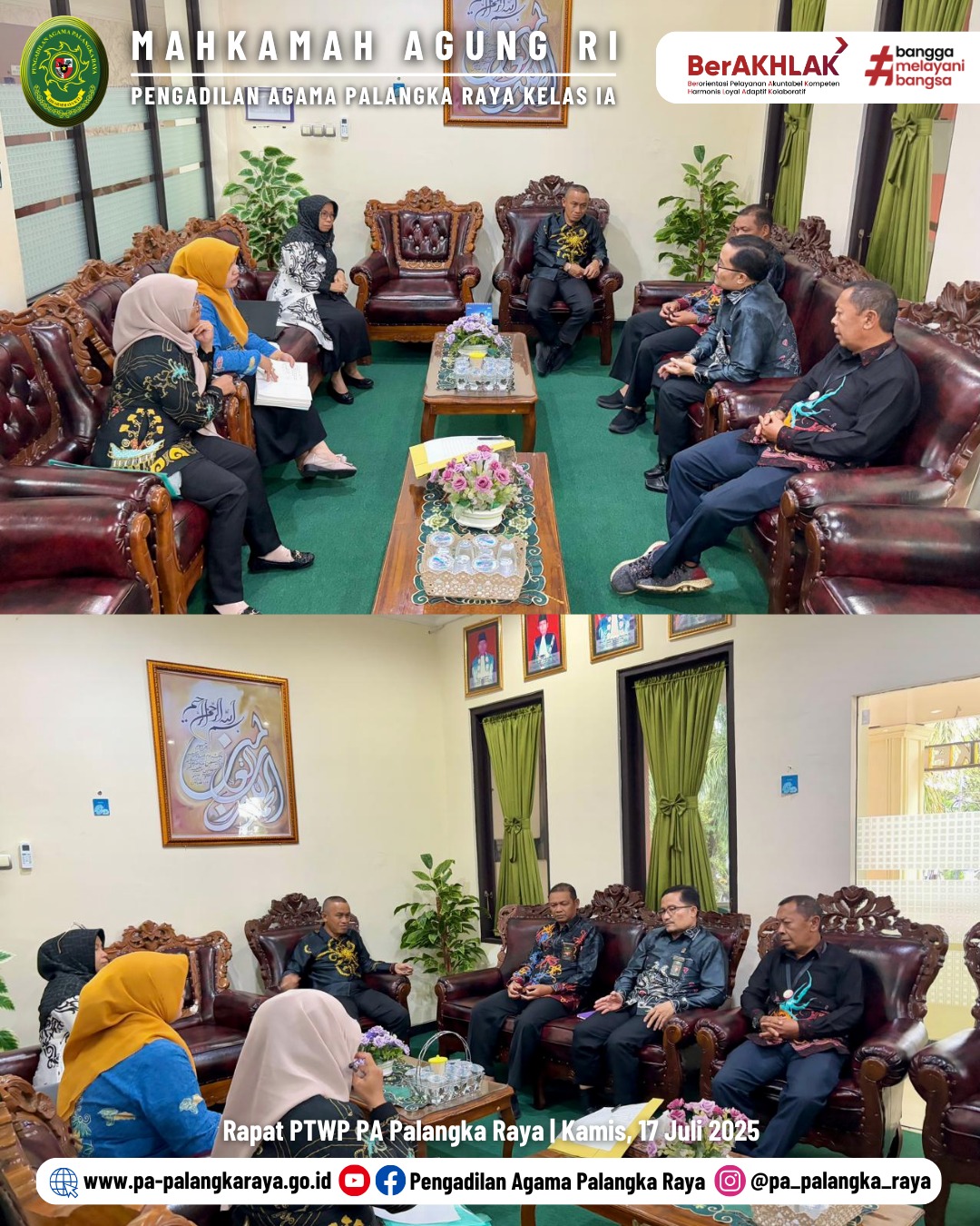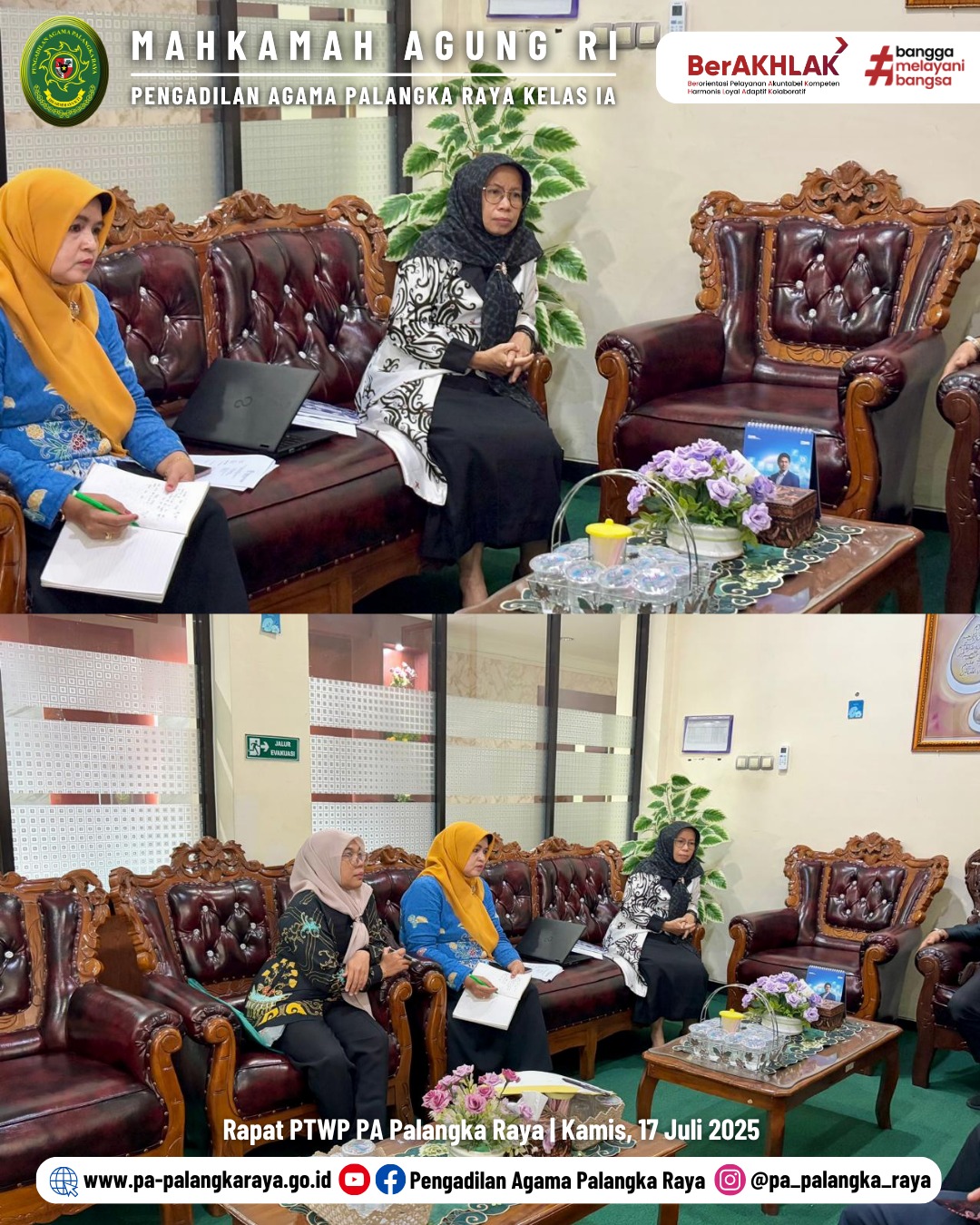 Bertempat di ruang tamu terbuka lantai 2 Pengadilan Agama Palangka Raya dilaksanakan rapat pengurus Persatuan Tenis Warga Peradilan (PTWP) untuk membahas berbagai hal terkait organisasi dan kegiatan PTWP. Rapat ini bertujuan untuk mengoordinasikan kegiatan, mengevaluasi kinerja, dan merencanakan program kerja PTWP. Kegiatan berlangsung tepat pada pukul 15.30 WIB s/d selesai. (17/07/2025).