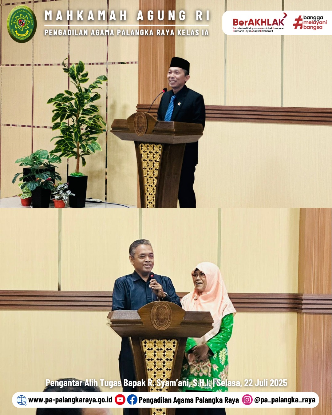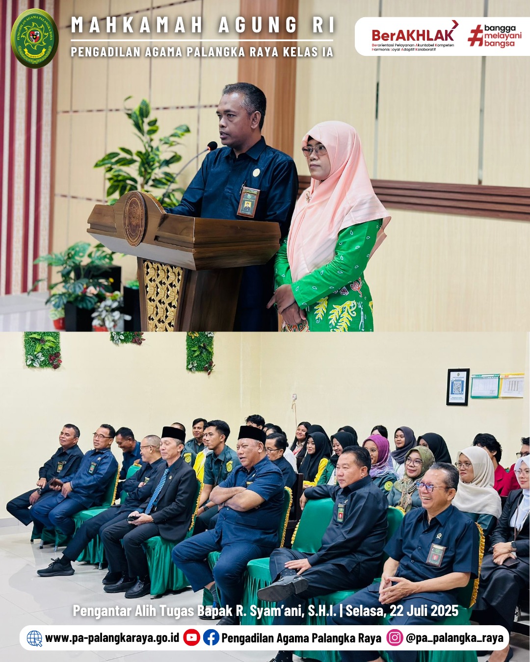 Suasana haru iringi acara pengantar alih tugas dan perpisahan Bapak Rahsiannor Syam’ani, S.H.I Panitera Pengganti Pengadilan Agama Palangka Raya yang akan promosi sebagai Panitera Pengadilan Agama Nanga Bulik Klas II. Acara berlangsung di ruang Aula Utama Pengadilan Agama Palangka Raya tepat pada pukul 14.00 WIB s/d selesai. Dengan dihadiri oleh pimpinan, para hakim dan segenap aparatur Pengadilan Agama Palangka Raya.