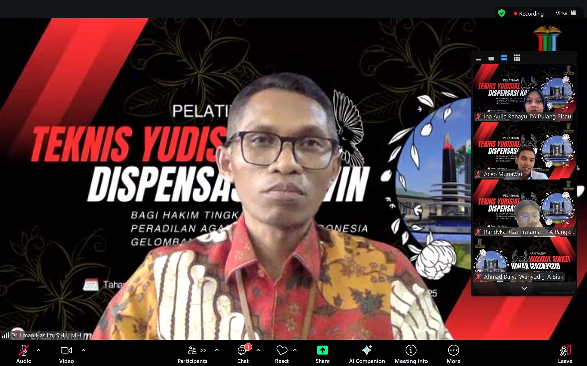 Pulang Pisau, 08 Desember 2025 – Ina Aulia Rahayu, S.H., Hakim Pengadilan Agama Pulang Pisau, kembali mengikuti rangkaian Pelatihan Teknis Yudisial Dispensasi Kawin bagi Hakim Tingkat Pertama Peradilan Agama seluruh Indonesia yang diselenggarakan secara daring. Pada sesi kedua ini, para peserta mendapatkan pendalaman materi mengenai Konsep Usia Perkawinan, yang disampaikan oleh narasumber Dr. Ilman Hasjim, S.H.I., M.H.