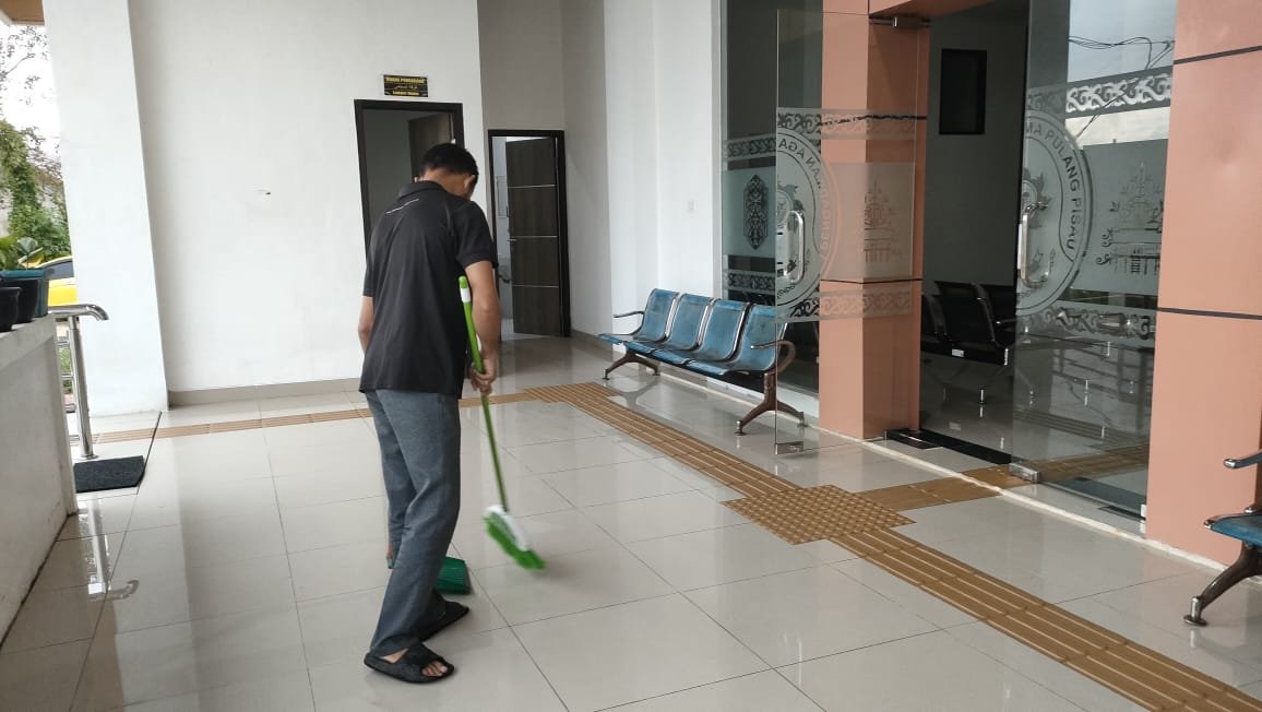Rabu, 10 Desember 2025 Muhammad Rapli Petugas kebersihan Pengadilan Agama Plang Pisau melaksanakan kegiatan bersih-bersih di area teras ruang siding pada pagi hari sebelum para pihak pencari keadilan datang ke kantor Pengadilan Agama Pulang Pisau. Kegiatan ini merupakan rutinitas yang dilakukan untuk memastikan area ruang sidang selalu dalam kondisi terbaik saat masyarakat mulai berdatangan pada pukul 08.00 WIB.