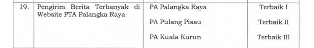 Prestasi membanggakan kembali diraih oleh Pengadilan Agama Pulang Pisau. Komitmen dalam membangun budaya publikasi yang aktif dan berkelanjutan membuahkan hasil, dimana Pengadilan Agama Pulang Pisau berhasil meraih penghargaan terbaik II sebagai pengirim berita terbanyak pada website resmi Pengadilan Tinggi Agama Palangka Raya.
