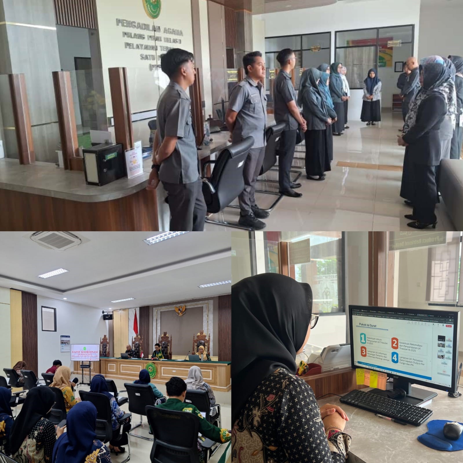 Selanjutnya, hari Rabu tanggal 8 Oktober 2025, dilaksanakan kegiatan Gerakan Monitoring dan Evaluasi di Awal Pagi (GEMA) di ruang pelayanan PA Pulang Pisau. Kemudian pada hari Kamis, Bendahara Penerimaan PA Pulang Pisau Putri Syah Norens, A.Md mengikuti Zoom FGD Blackmores bersama KPPN Palangkaraya melalui zoom meeting.