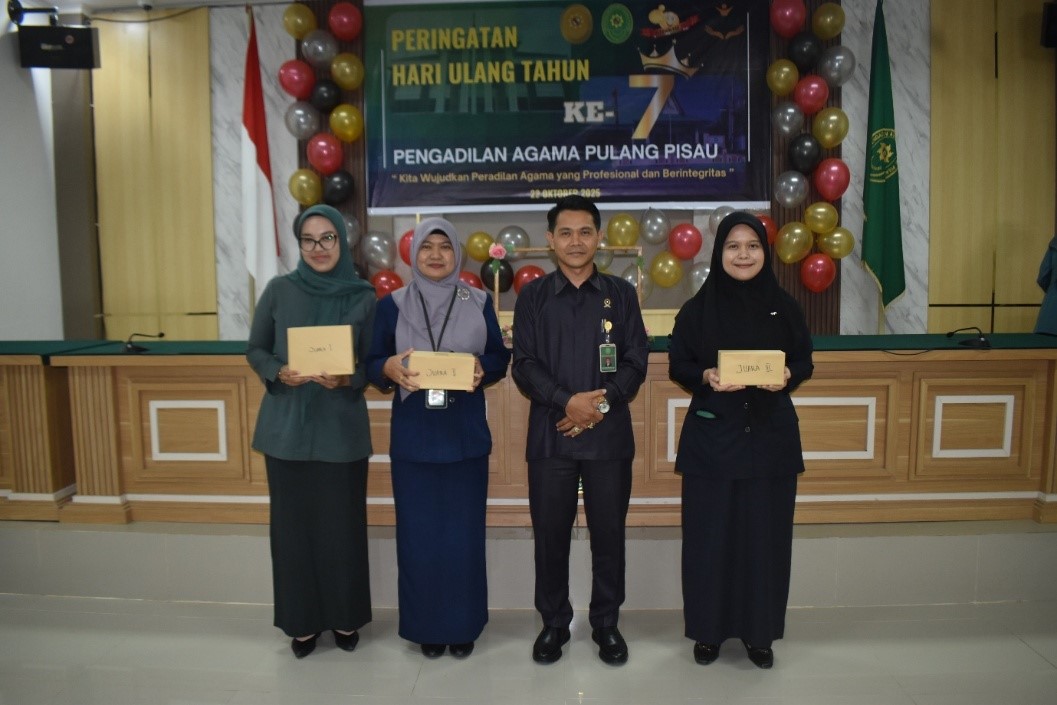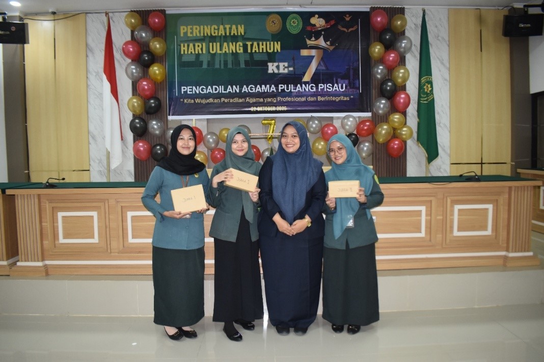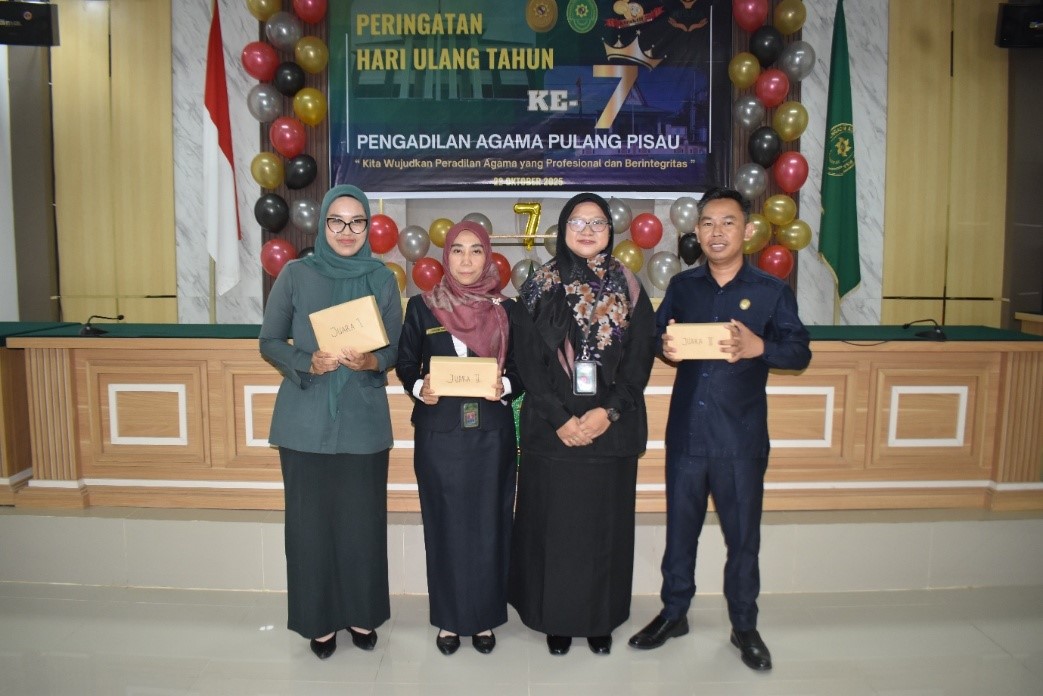 Suasana penuh keceriaan dan kehangatan mewarnai rangkaian acara Hari Ulang Tahun Pengadilan Agama Pulang Pisau ke-VII tahun 2025. Acara yang digelar di ruang sidang utama Pengadilan Agama Pulang Pisau ini menjadi ajang kebersamaan seluruh keluarga besar Pengadilan Agama Pulang Pisau. Untuk memeriahkan rangkaian acara HUT maka kegiatan diselingi dengan momen yang paling ditunggu-tunggu, yaitu pembagian hadiah perlombaan pada acara Family Gathering yang sebelumnya telah digelar.