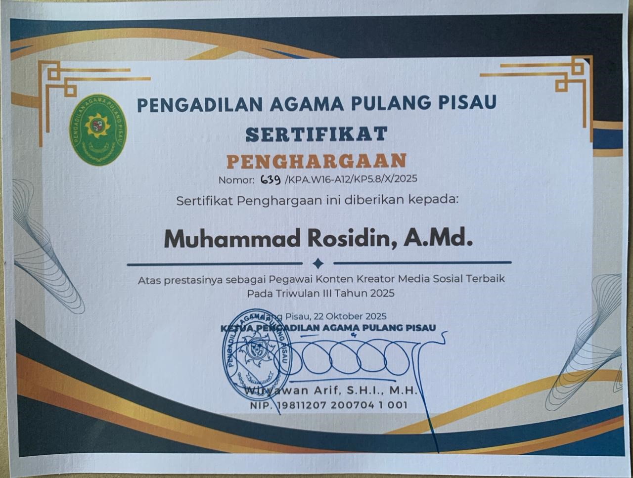 Pulang Pisau, 22 Oktober 2025 – Salah satu pegawai Pengadilan Agama Pulang Pisau, Muhammad Rosidin berhasil meraih Penghargaan Konten Kreator Terbaik Triwulan III Tahun 2025. Penghargaan tersebut diumumkan bertepatan dengan peringatan Hari Ulang Tahun Pengadilan Agama Pulang Pisau yang ke-7.