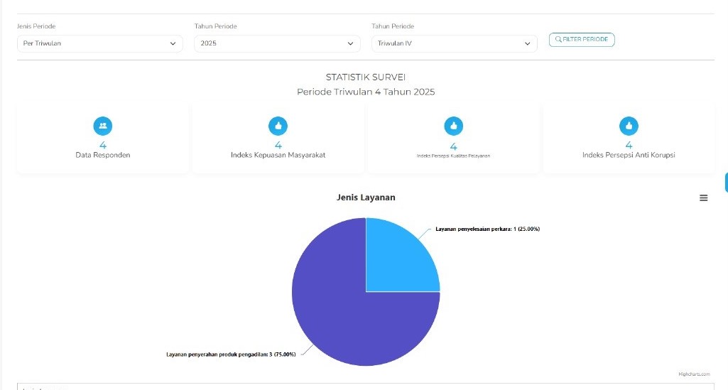 Berdasarkan data periode Triwulan IV Tahun 2025 (per Oktober), tercatat sebanyak empat responden telah berpartisipasi dalam survei ini. Hasil survei menunjukkan capaian positif, dengan Indeks Kepuasan Masyarakat (IKM), Indeks Persepsi Kualitas Pelayanan (IPKP), dan Indeks Persepsi Anti Korupsi (IPAK) yang sama-sama memperoleh nilai 4, menandakan tingkat kepuasan yang baik dari para pengguna layanan.