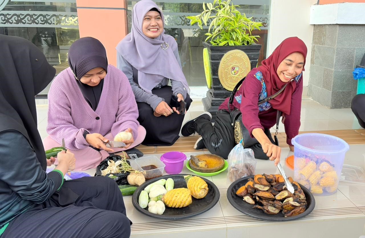Usai kegiatan jalan sehat, para pegawai beristirahat sejenak sambil menikmati makanan dan minuman ringan yang telah disediakan berupa rebusan ubi, jangung, pisang dan rujak buah serta singkong goreng menambah hangatnya suasana kebersamaan dengan diselingi diiringi canda dan tawa para pegawai.
