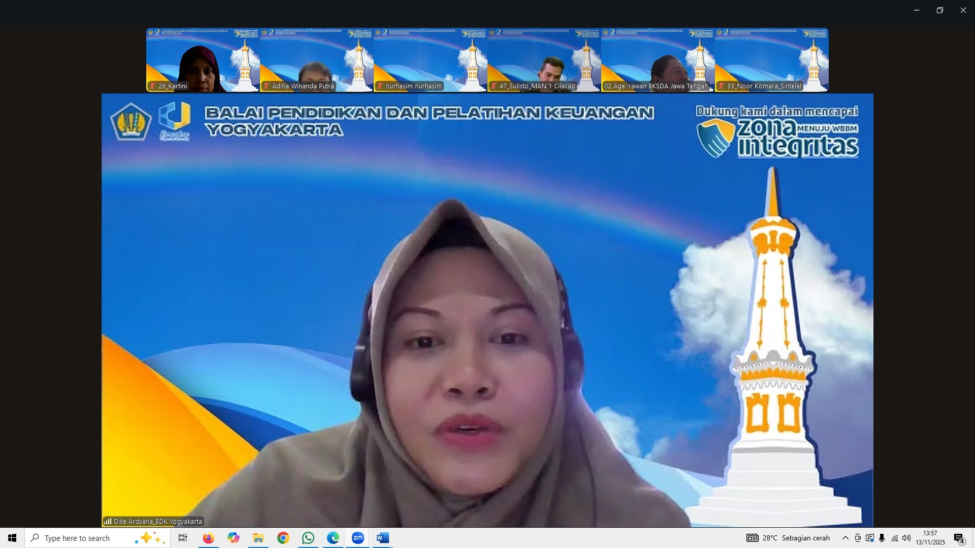 Kamis, 13 November 2025. Hari Keempat Bendahara Pengeluaran Pengadilan Agama Pulang Pisau Kartini, S.H.I. kembali mengikuti kegiatan dengan seksama Pelatihan Jarak jauh (PJJ) Bendahara dan Bendahara Pembantu Angkatan V yang diselenggarakan oleh Balai Diklat Keuangan (BDK) Yogyakarta di ruang kerjanya secara virtual.