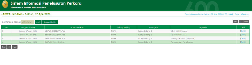Pulang Pisau – Pengadilan Agama Pulang Pisau kembali melaksanakan kegiatan persidangan rutin pada Selasa (7/4/2026). Dalam agenda hari tersebut, majelis hakim menangani sebanyak empat perkara yang telah dijadwalkan sebelumnya.