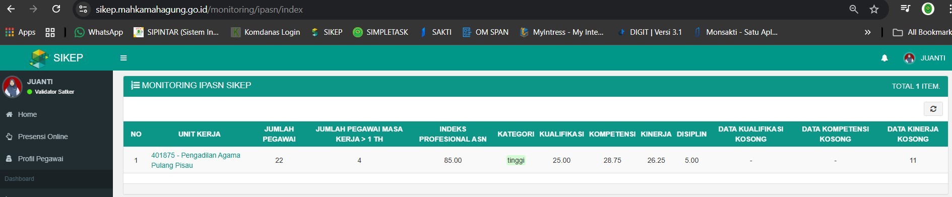 Skor Indeks Profesionalitas ASN PA Pulang Pisau Terpantau Tinggi