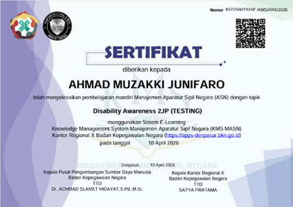 Jumat, 10 April 2026. Sebagai bagian dari pembentukan karakter ASN yang inklusif, Muzakki mengikuti materi E-Learning dari Kanreg BKN Denpasar mengenai Disability Awareness. Materi ini memberikan pemahaman tentang cara berinteraksi yang tepat dengan penyandang disabilitas serta pentingnya menciptakan lingkungan yang ramah dan setara.