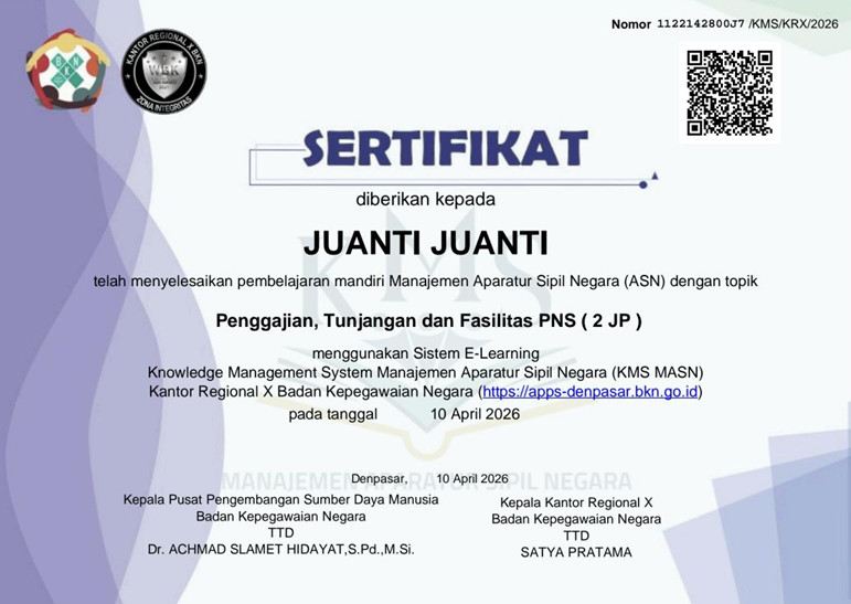 Berdasarkan sertifikat yang diterbitkan oleh Kantor Regional X Badan Kepegawaian Negara, kegiatan e-learning tersebut telah diselesaikan pada tanggal 10 April 2026. Sertifikat ini menjadi bukti komitmen dalam meningkatkan pemahaman terkait manajemen kepegawaian, khususnya dalam aspek kesejahteraan pegawai negeri sipil.