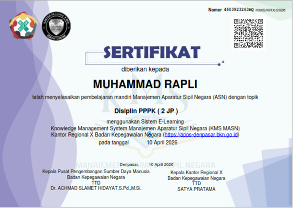 Melalui sistem e-learning ini, para peserta PPPK dapat mengakses berbagai modul materi penting, mulai dari Pengadaan PPPK, Pengembangan Kompetensi, hingga Penilaian Kinerja. Setiap peserta yang berhasil menyelesaikan materi dan lulus dalam evaluasi (post-test) akan mendapatkan sertifikat digital sebagai bukti pengembangan kompetensi senilai 2 Jam Pelajaran (JP).