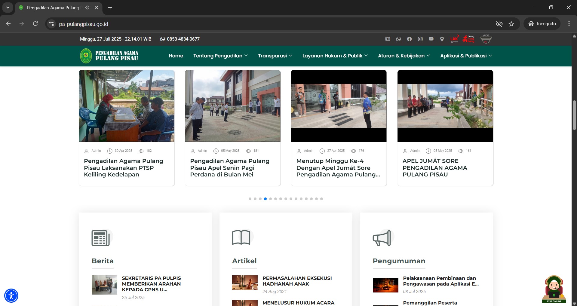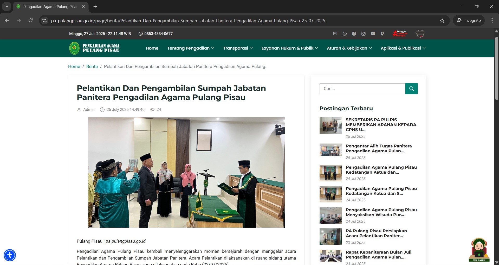 Pulang Pisau, 22 Juli 2025 — Pengadilan Agama Pulang Pisau resmi meluncurkan tampilan baru website resminya yang beralamat di www.pa-pulangpisau.go.id, pada hari Selasa lalu, 22 Juli 2025. Pembaruan ini dilakukan sebagai bagian dari upaya peningkatan pelayanan informasi publik dan aksesibilitas digital kepada masyarakat.