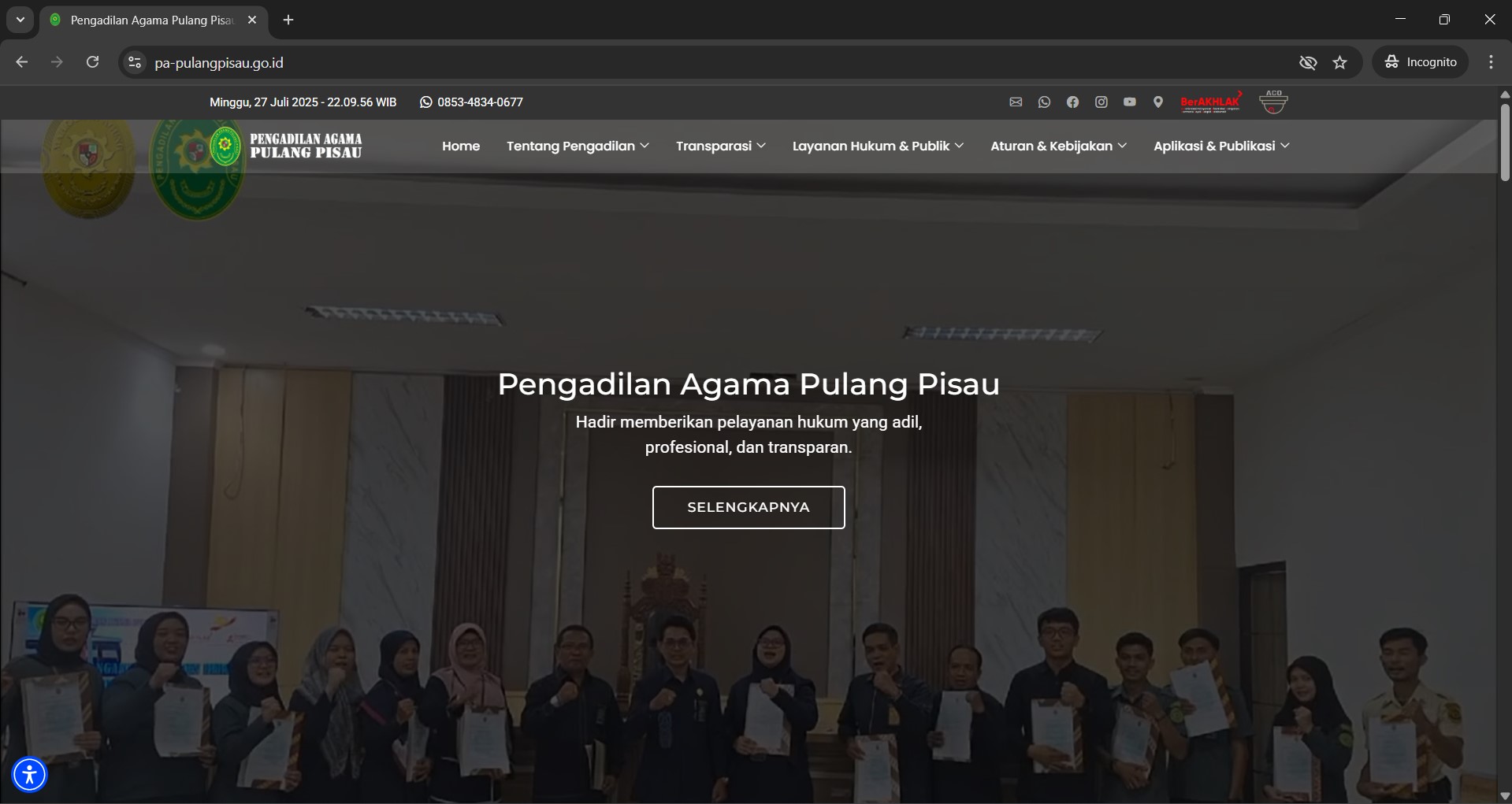 Pulang Pisau, 22 Juli 2025 — Pengadilan Agama Pulang Pisau resmi meluncurkan tampilan baru website resminya yang beralamat di www.pa-pulangpisau.go.id, pada hari Selasa lalu, 22 Juli 2025. Pembaruan ini dilakukan sebagai bagian dari upaya peningkatan pelayanan informasi publik dan aksesibilitas digital kepada masyarakat.