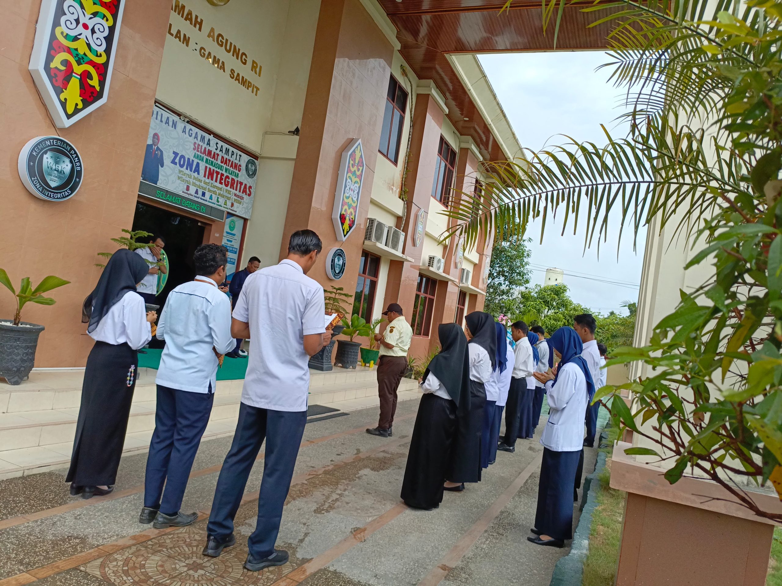 Pemandangan rutin setiap hari Senin yaitu pelaksaan Apel Senin Pagi (30/6/2025). Kegiatan ini dilaksanakan di halaman Kantor Pengadilan Agama Sampit yang diikuti oleh Hakim dan Aparatur. Dalam apel kali ini Satpam Ragil Tri Wicaksana bertugas sebagai komandan apel dan Ketua PA Sampit Bapak Mohammad Mahin Ridlo Afifi, S.H.I., M.H., bertindak sebagai pembina apel. Disisi lain petugas yang kali ini bertugas dengan MC Bunga Setymika, SH., Pembaca 8 Nilai Utama MA Bapak Apriansyah, S.H., dan Fahmi Fardiansyah, S.H., bertugas sebagai pembaca doa.