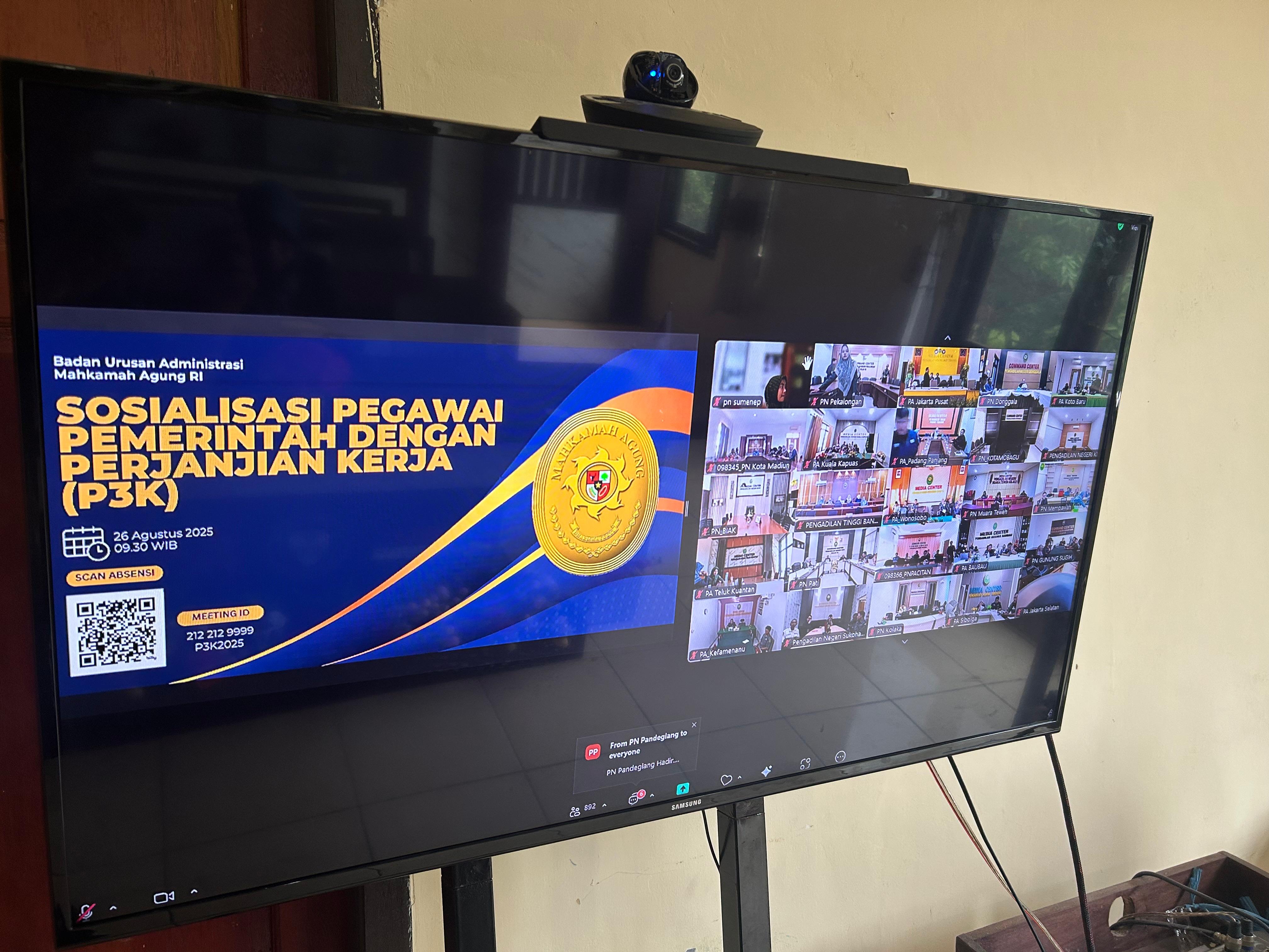 Bertempat di ruang media center Kasubbag Kepegawaian dan Ortala Ibu Umi Watini, A.Md, bersama para PPPK PA Sampit mengikuti kegiatan Sosialisasi Pegawai Pemerintah Dengan Perjanjian Kinerja Secara Daring dimulai dari jam 09.30-selesai WIB (26/8/2025). Kegiatan tersebut diselenggarakan oleh BUA MA RI secara zoom meeting (daring).
