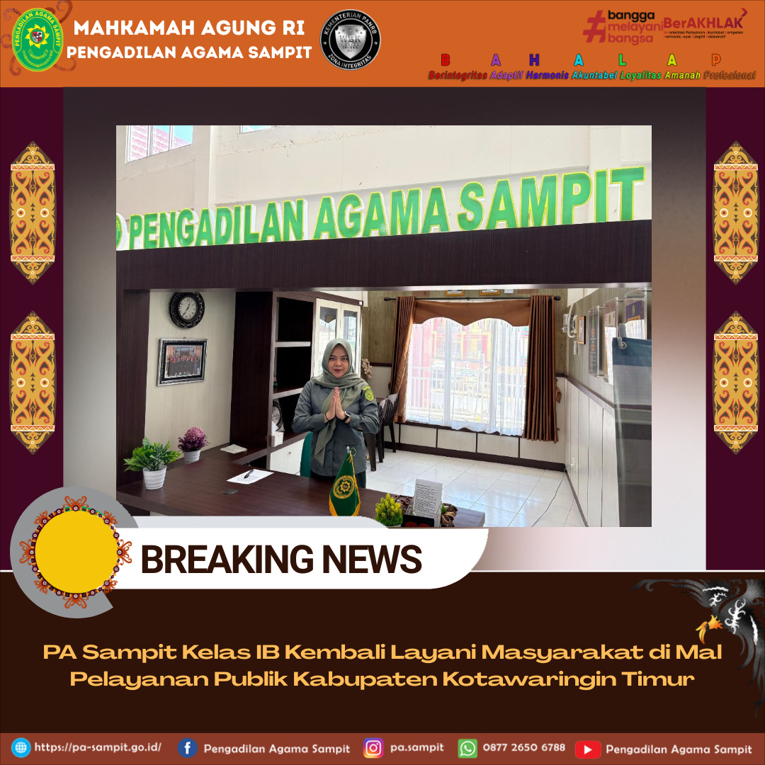 Rabu, (08/10/2025) Pengadilan Agama Sampit kembali hadir memberikan layanan langsung kepada masyarakat melalui Mal Pelayanan Publik (MPP) Kabupaten Kotawaringin Timur yang berlokasi di Jalan MT. Haryono, Kelurahan Mentawa Baru Hulu, Kecamatan Mentawa Baru Ketapang, Kabupaten Kotawaringin Timur. Aktivasi kembali layanan ini menjadi bukti nyata komitmen Pengadilan Agama Sampit dalam menghadirkan pelayanan yang mudah, cepat, dan dekat dengan masyarakat.