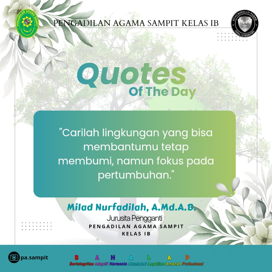Pengadilan Agama Sampit Kelas IB kembali menghadirkan inovasi sederhana namun berdampak positif melalui program “Quotes of The Day”, sebuah konten motivasi harian yang ditujukan untuk membangun semangat bekerja di lingkungan peradilan. Pada edisi terbaru, kutipan inspiratif disampaikan oleh Milad Nurfadilah, A.Md.A.B., selaku Jurusita Pengganti di Pengadilan Agama Sampit Kelas IB.