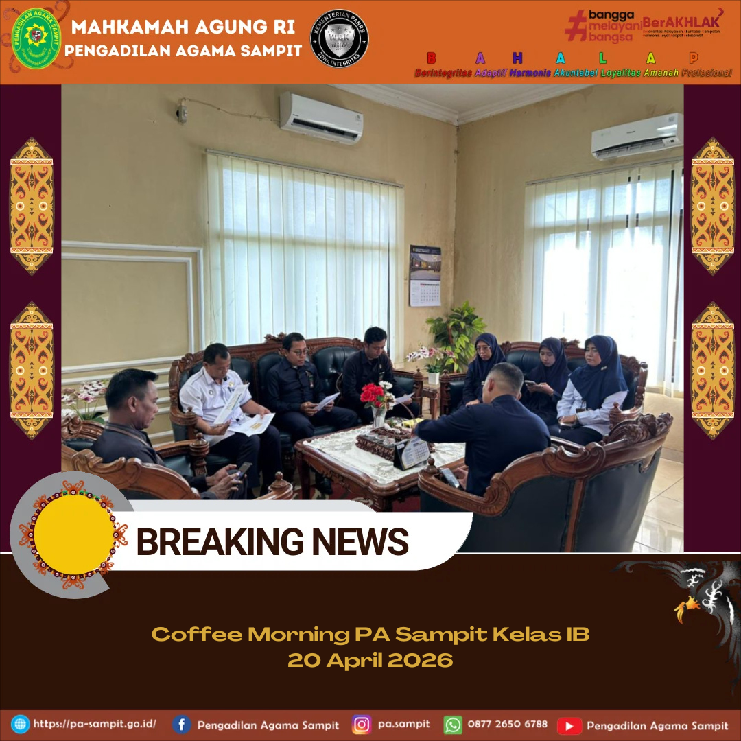Sampit – Senin, 20 April 2026 Pengadilan Agama Sampit kembali melaksanakan coffee morning bertempat di Ruang Ketua Pengadilan Agama Sampit. Coffee morning dihadiri Ketua, Wakil Ketua, seluruh Hakim, Panitera dan Sekretaris. Acara dimulai pada pukul 08.20 WIB