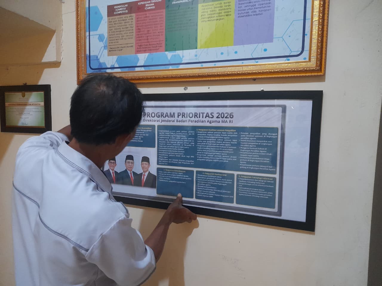 Sampit, 20 April 2026 — Dalam rangka mendukung implementasi kebijakan strategis di lingkungan peradilan agama, Pegawai Umum Pengadilan Agama Sampit Kelas IB melakukan pemasangan figura Program Prioritas Direktorat Jenderal Badan Peradilan Agama (Dirjen Badilag) Tahun 2026 di area lobi kantor pada Senin (20/04/2026).