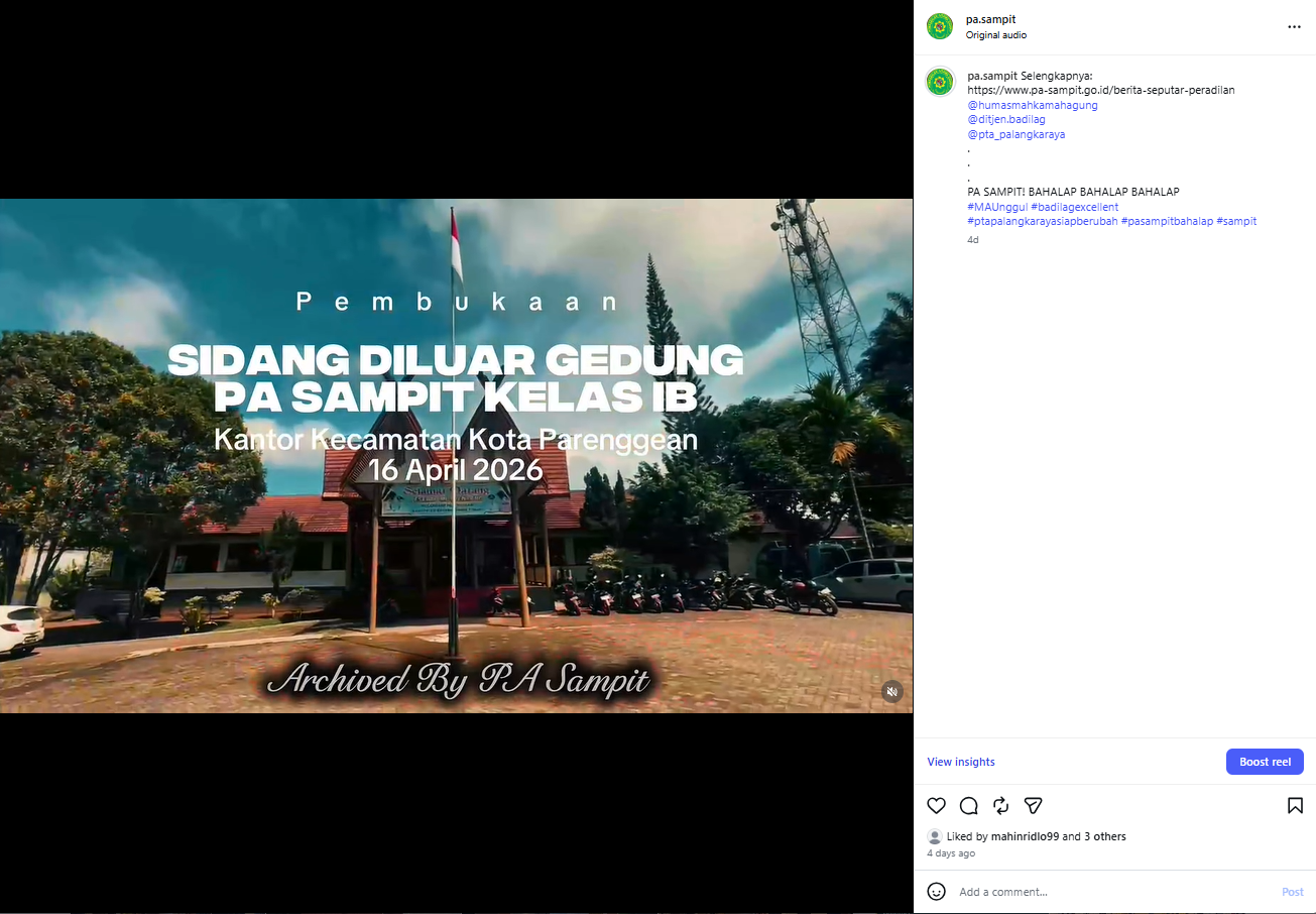 Parenggean, 16 April 2026 — Pengadilan Agama (PA) Sampit Kelas IB melaksanakan pembukaan sidang di luar gedung yang bertempat di Kantor Kecamatan Kota Parenggean, Kamis (16/04/2026). Kegiatan tersebut turut didokumentasikan melalui video sebagai bagian dari publikasi dan transparansi informasi kepada masyarakat.
