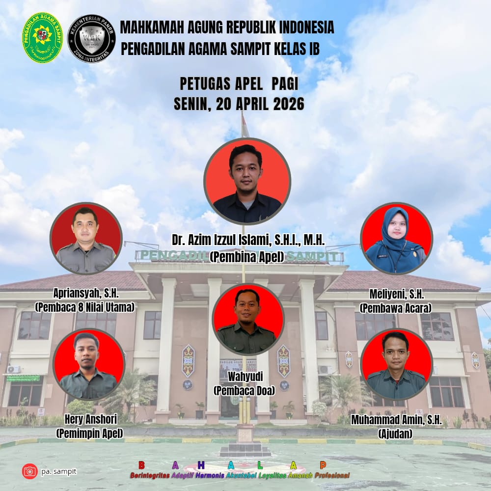 Sampit, 20 April 2026 — Pengadilan Agama Sampit Kelas IB telah menetapkan susunan petugas apel pagi yang dilaksanakan pada Senin, 20 April 2026. Penunjukan petugas ini merupakan bagian dari upaya menjaga kedisiplinan serta kelancaran pelaksanaan apel pagi sebagai sarana pembinaan dan koordinasi bagi seluruh aparatur.