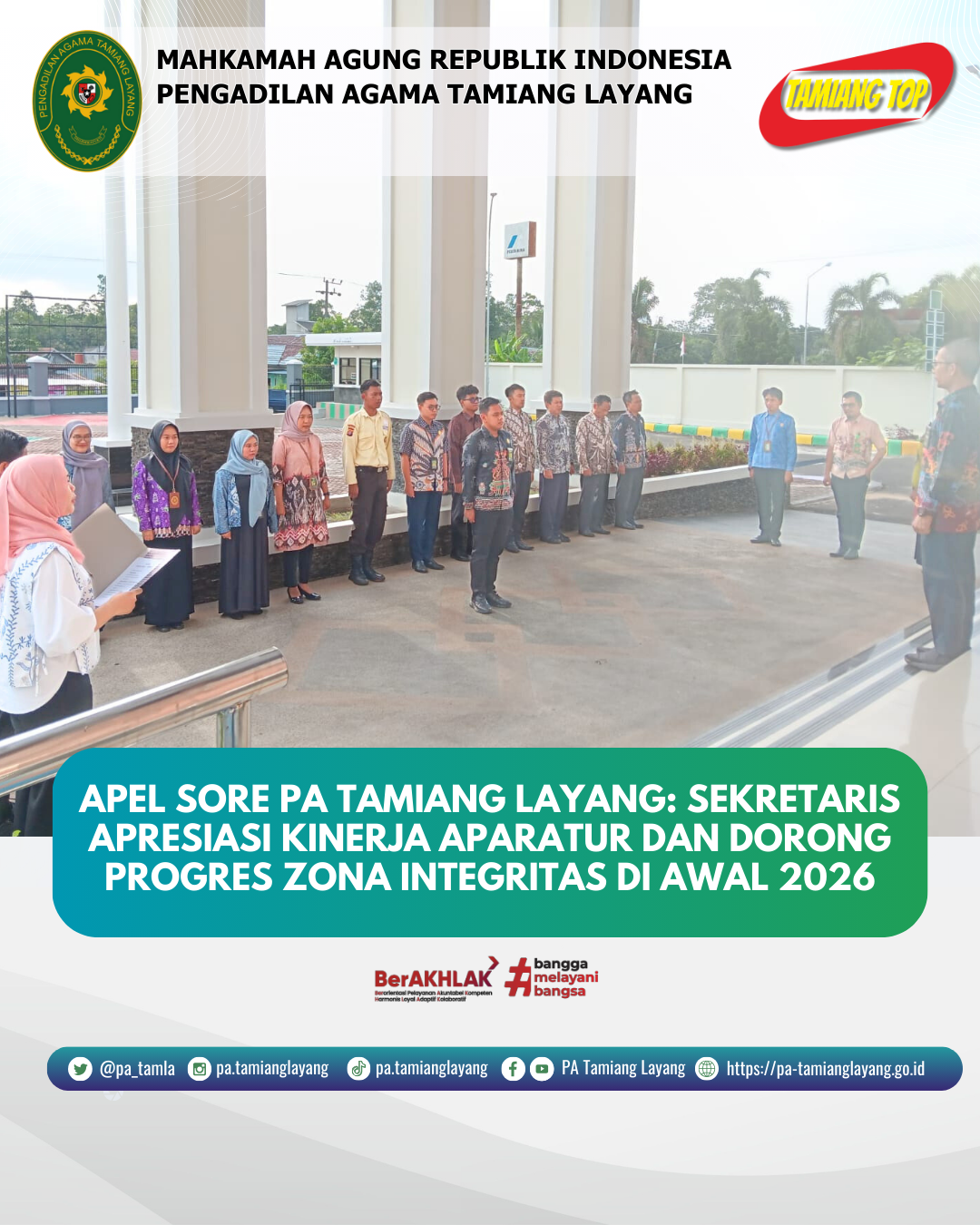 Tamiang Layang, Jumat,23 Januari 2026 – Pengadilan Agama (PA) Tamiang Layang melaksanakan Apel Sore pada akhir pekan kerja yang dipimpin oleh Sekretaris PA Tamiang Layang, Norrachmad Ariyanto, S.T., M.E. Kegiatan ini diikuti oleh seluruh aparatur PA Tamiang Layang dan berlangsung dengan tertib serta penuh semangat kebersamaan.