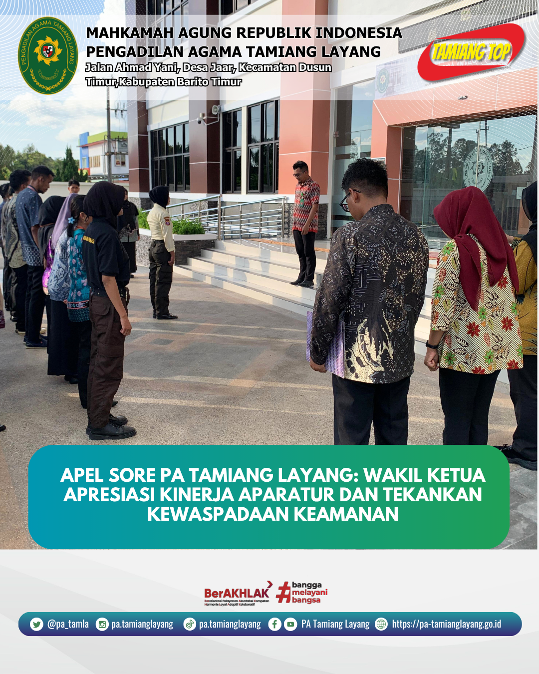 Apel sore ini menjadi momentum evaluasi sekaligus penguatan komitmen seluruh aparatur dalam menjaga profesionalitas kerja serta keamanan lingkungan Pengadilan Agama Tamiang Layang. Dengan sinergi yang baik, diharapkan pelayanan kepada masyarakat dapat terus berjalan optimal dan terpercaya.