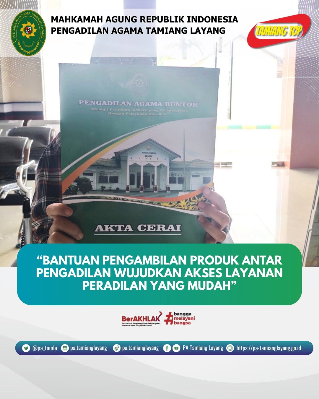 Melalui layanan bantuan pengambilan produk Pengadilan ini, Pengadilan Agama Tamiang Layang berharap dapat memberikan manfaat nyata bagi masyarakat serta mendukung terwujudnya pelayanan peradilan yang sederhana, cepat, dan berbiaya ringan, sebagaimana amanat reformasi birokrasi dan peningkatan kualitas pelayanan publik di lingkungan peradilan. _Ly