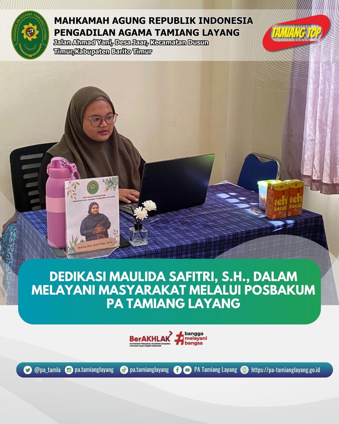 Petugas Posbakum Pengadilan Agama Tamiang Layang saat ini adalah Maulida Safitri, S.H., gadis lulusan Universitas Lambung Mangkurat (ULM) Banjarmasin tahun 2023 ini telah bergabung dengan Lembaga Bantuan Hukum Barito Terbit sejak tahun 2024 dan dipercaya untuk memberikan layanan bantuan hukum di PA Tamiang Layang.