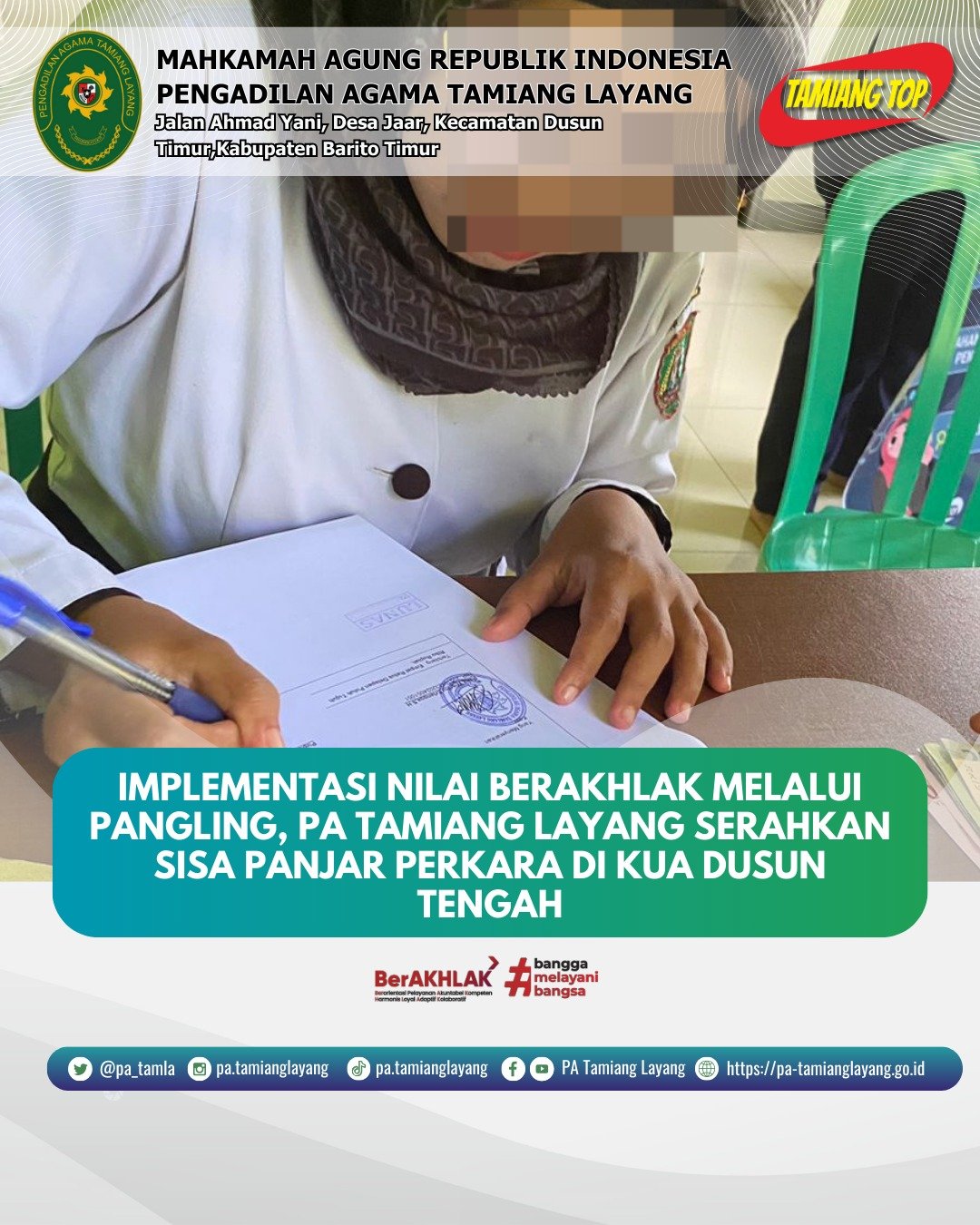 Pengadilan Agama Tamiang Layang terus memperkuat budaya kerja aparatur dengan mengimplementasikan nilai dasar ASN BerAKHLAK melalui program PANGLING (Pengadilan Agama Tamiang Layang Berkeliling). Salah satu kegiatan dalam program tersebut adalah penyerahan sisa panjar perkara kepada para pihak yang dilaksanakan pada Senin, 9 Februari 2026, bertempat di Kantor KUA Dusun Tengah.