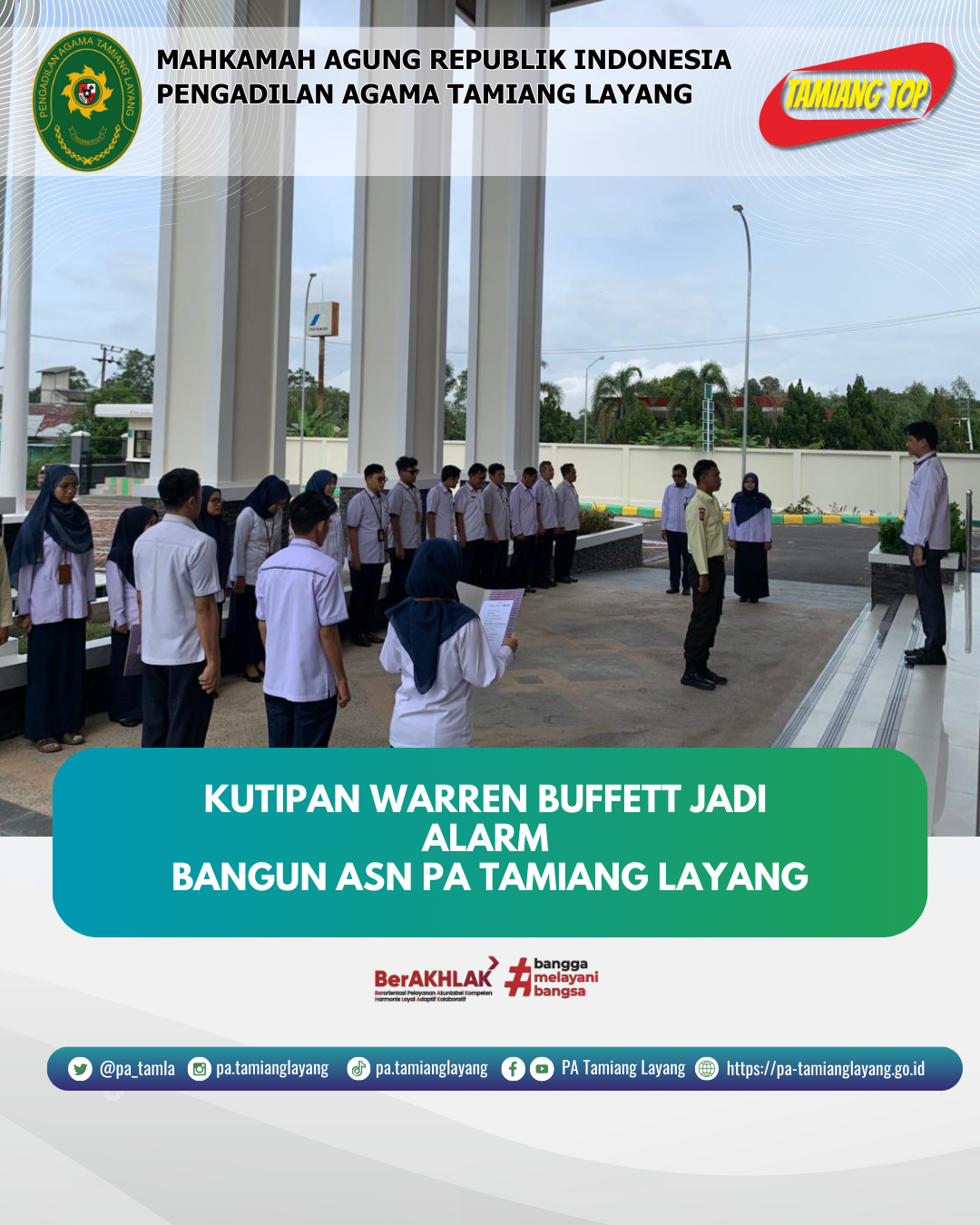 Lebih jauh, Ketua Pengadilan mengaitkan filosofi Warren Buffett tersebut dengan dua nilai utama BerAKHLAK, yakni Kompeten dan Adaptif. Nilai Kompeten tercermin dari keharusan setiap pegawai untuk terus belajar, meningkatkan keterampilan, serta mengasah kemampuan agar mampu memberikan pelayanan terbaik kepada masyarakat. Sementara nilai Adaptif menuntut seluruh aparatur untuk tidak kaku terhadap perubahan, melainkan sigap menyesuaikan diri dengan dinamika teknologi, regulasi, dan tuntutan pelayanan publik.