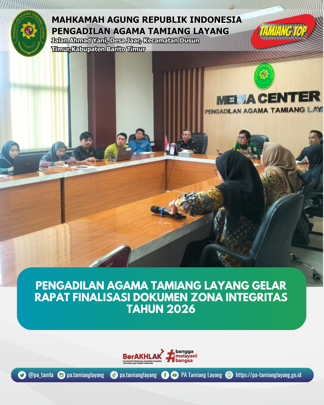 Tim Pembangunan Zona Integritas Pengadilan Agama Tamiang Layang yang diketuai Oleh Muhammad Rezani, S.H.I melaksanakan finalisasi dokumen Zona Integritas pada Jumat, 13 Maret 2026. Kegiatan tersebut bertempat di Media Center Pengadilan Agama Tamiang Layang dan dihadiri oleh seluruh Koordinator masing masing area serta seluruh tim ZI.