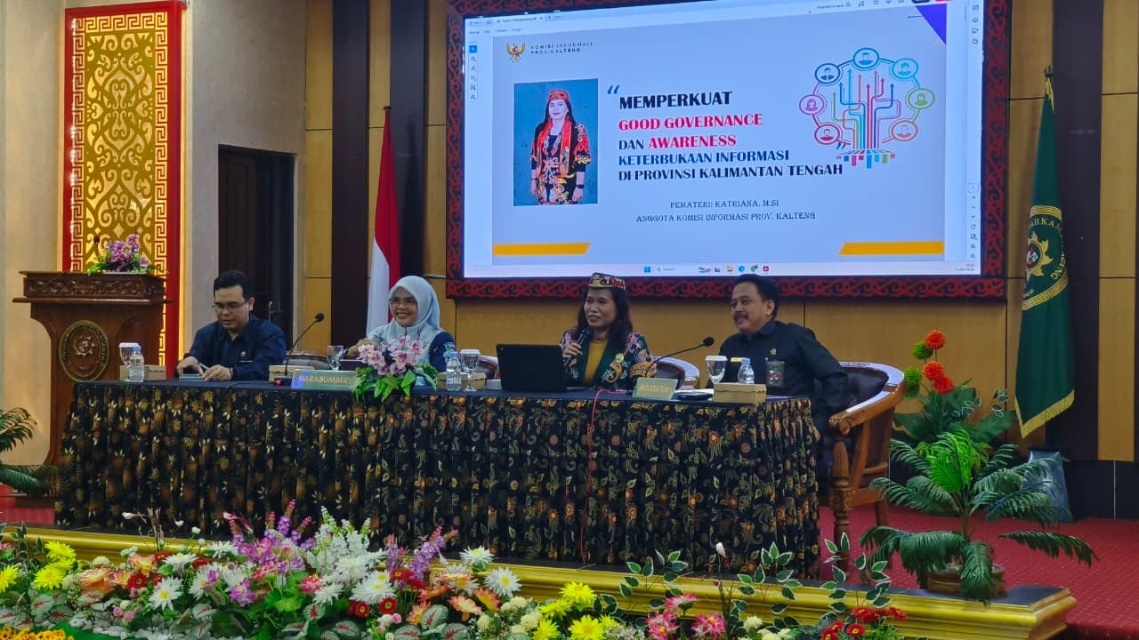 Sesi pertama pada sosialisasi oleh Komisi Informasi Provinsi Kalimantan Tengah disampaikan oleh Komisioner Komisi Informasi Bidang ESA Katriana, M.Si. dengan judul Memperkuat Good Governance dan Awareness Keterbukaan Informasi di Provinsi Kalimantan Tengah.