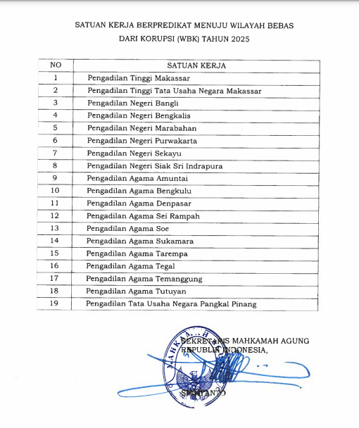 Akhinya kabar bahagia itu hadir juga dengan terbitnya surat keputusan Sekretaris Mahkamah Agung RI Nomor : 27570/SEK/SK.PW1/XI/2025 tertanggal 28 November 2025 tentang Penetapan Satuan Kerja Berpredikat Menuju Wilayah Bebas dari Korupsi Tahun 2025. Dalam lampiran surat keputusan tersebut tercantum Pengadilan Agama Sukamara yang menjadi salah satu dari sembilan belas satuan kerja yang telah ditetapkan untuk menerima predikat Wilayah Bebas dari Korupsi (WBK).