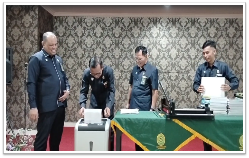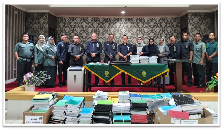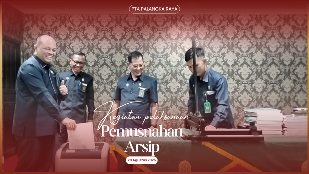 Rabu, 20 Agustus 2025 – Pengadilan Tinggi Agama Palangka Raya untuk pertama kalinya melakukan pemusnahan arsip dinamis sejak berdirinya PTA Palangka Raya sejak tahun 1986 dengan prosedur pemusnahan arsip berpedoman kepada Undang-Undang Nomor 43 Tahun 2009 tentang Kearsipan dan Peraturan Pemerintah Nomor 28 Tahun 2012 tentang Pelaksanaan Undang-Undang Nomor 43 tahun 2009 tentang Kearsipan. Pemusnahan arsip bertujuan mewujudkan pengelolaan arsip yang tertib, efektif dan efisien, mengurangi volume arsip yang setiap tahun semakin meningkat sehingga ruang penyimpanan arsip perlu dimaksimalkan. Pemusnahan arsip dilakukan terhadap arsip yang telah habis masa retensi, tidak bernilai guna, tidak berhubungan dengan perkara serta tidak ada Undang-Undang yang melarang.