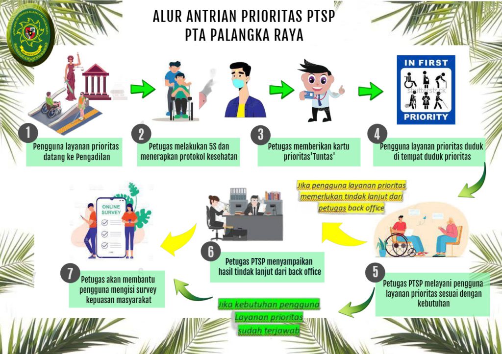 Diagram alur antrian prioritas diperuntukan bagi para pencari keadilan khususnya penyandang disabilitas yang dilengkapi dengan video bahasa isyarat, agar penyandang disabilitas bisa lebih mudah memahami alur pelayanan PTSP di Pengadilan Tinggi Agama Palangka Raya. Hal ini salah satu wujud komitmen Pengadilan Tinggi Agama Palangka Raya terhadap Surat Keputusan Direktur Jenderal Badan Peradilan Agama Nomor : 2078/DjA/HK.00/SK/8/2022 tentang Pedoman Pelaksanaan Pelayanan Ramah Penyandang Disabilitas di Pengadilan dalam Lingkungan  Peradilan Agama