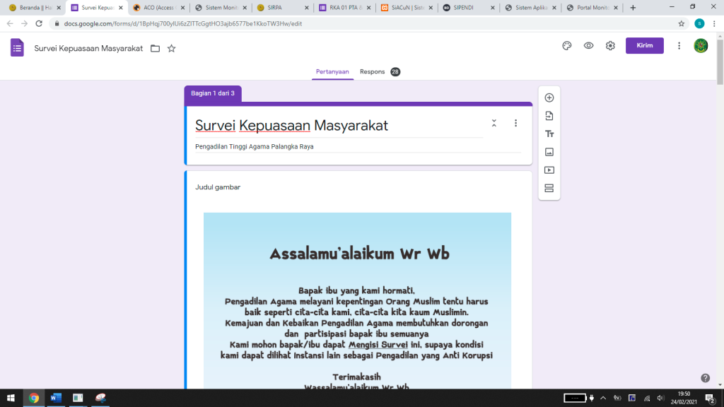 Aplikasi Survei Kepuasan Masyarakat bertujuan mengukur kepuasan pelayanan yang diberikan oleh PTA. Palangka Raya kepada para tamu yang datang ke PTA. Palangka Raya. Aplikasi ini di tempatkan pada PTS, dimana setiap tamu yang datang selain mengisi buku tamu secara elektronik juga diminta untuk mengisi survei tersebut. Dan data survei diolah oleh Tim khusus yang ditugaskan oleh Ketua Pengadilan Tinggi Agama Palangka Raya.