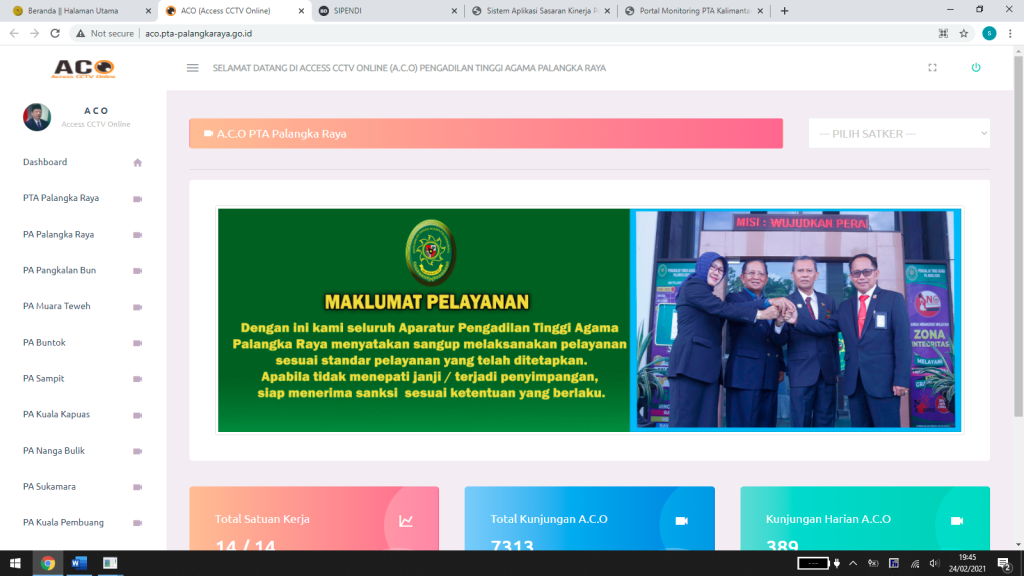 Aplikasi CCTV Online  (ACO) : Merupkan apalikasi pengawasan yang dilakukan secara langsung secara online, yang menjadi objek yang diawasi adalah PTSP, pelaksanaan Apel Senin dan Jum’at pada Pengadilan Agama se Kalimantan Tengah. Tapi sekarang aplikasi ini diambil alih oleh Badilag dan diberlakukan secara nasional pada seluruh Peradilan Agama se Indonesia