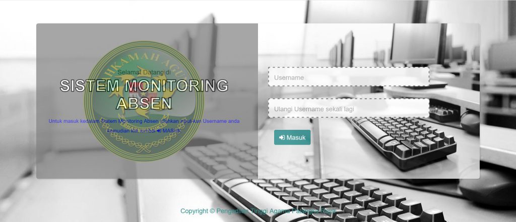 Aplikasi Sistem Monitoring Absesinsi merupakan sebuah aplikasi yang diciptakan bertujuan untuk pengawasan terhadap kehadiran pegawai se-Kalimantan Tengah, baik  masuk atau pulang dengan menggunakan jaringan internet. Aplikasi ini diberlakukan di seluruh pengadilan Agama Se – Kalimantan Tengah, dimana PTA. Palangka Raya dapat mengetahui seluruh pegawai yang terlambat masuk maupun cepat pulang, baik di PTA. Palangka Raya sendiri dan juga seluruh Pengadilan Agama Se-Kalimantan Tengah.